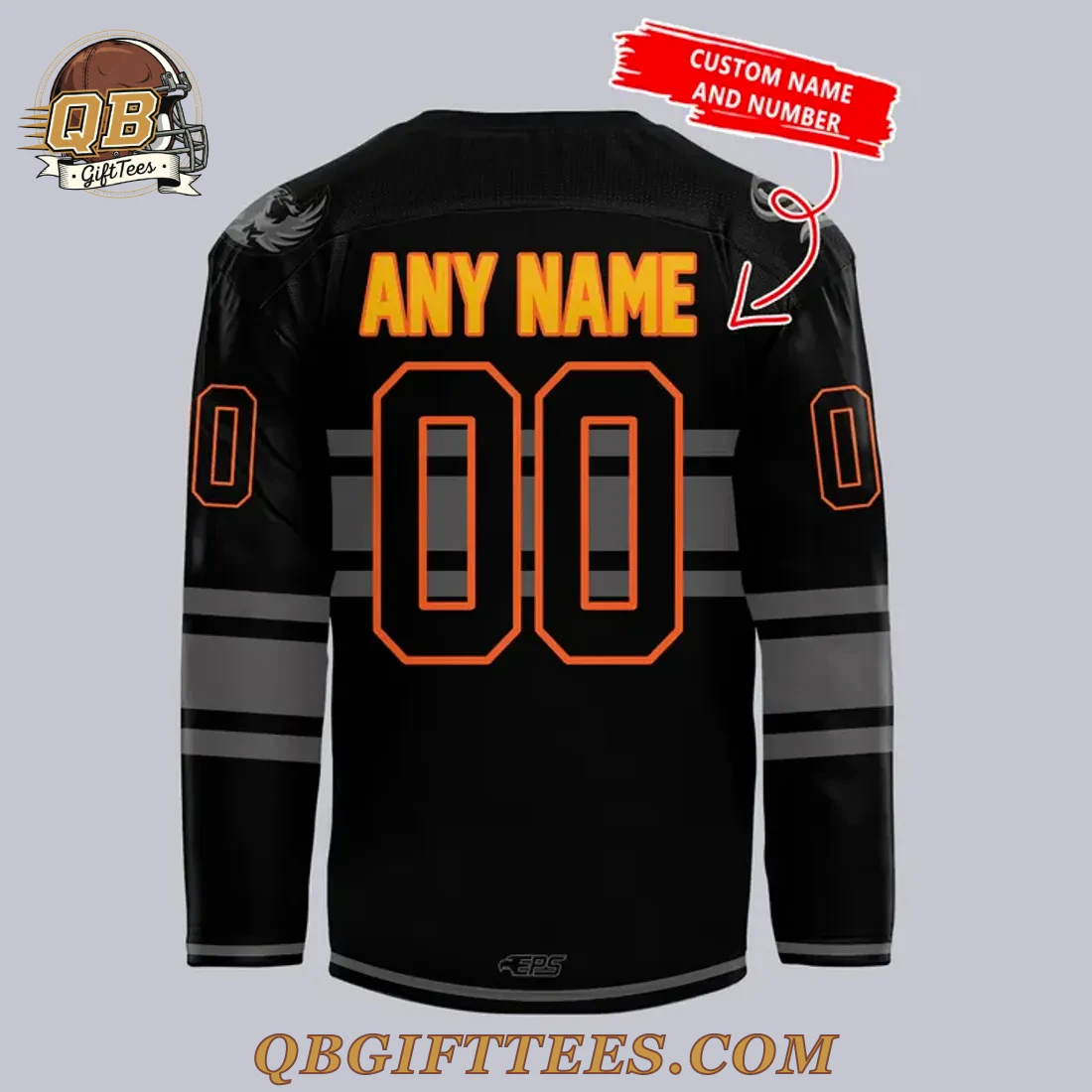 The Kansas City Mavericks Blackout Limited Edition Hockey Jersey offers a distinctive way for fans to showcase their pride and connection to the team. This jersey captures the spirit of the Mavericks with a sleek, modern design that appeals to supporters looking for unique fan apparel. The jersey features a predominant black base, creating a “blackout” effect. On the front, a bold “KC” emblem in dark grey with a vibrant orange outline is centrally displayed. The V-neck collar is black and includes the “ATK” logo. Both upper sleeves feature a solo orange “0” number, while the lower sleeves are adorned with two horizontal dark grey stripes. Subtle phoenix-like graphics in a darker grey or black tone are visible on the top shoulder panels. The reverse side mirrors the sleeve details and showcases customizable name and number options in bright orange, accompanied by the “EPS” logo at the lower back hem. This fan jersey is crafted from a performance-grade polyester fabric, designed for comfort and longevity. Specific fabric weight and dimensions are not visible from the product imagery.