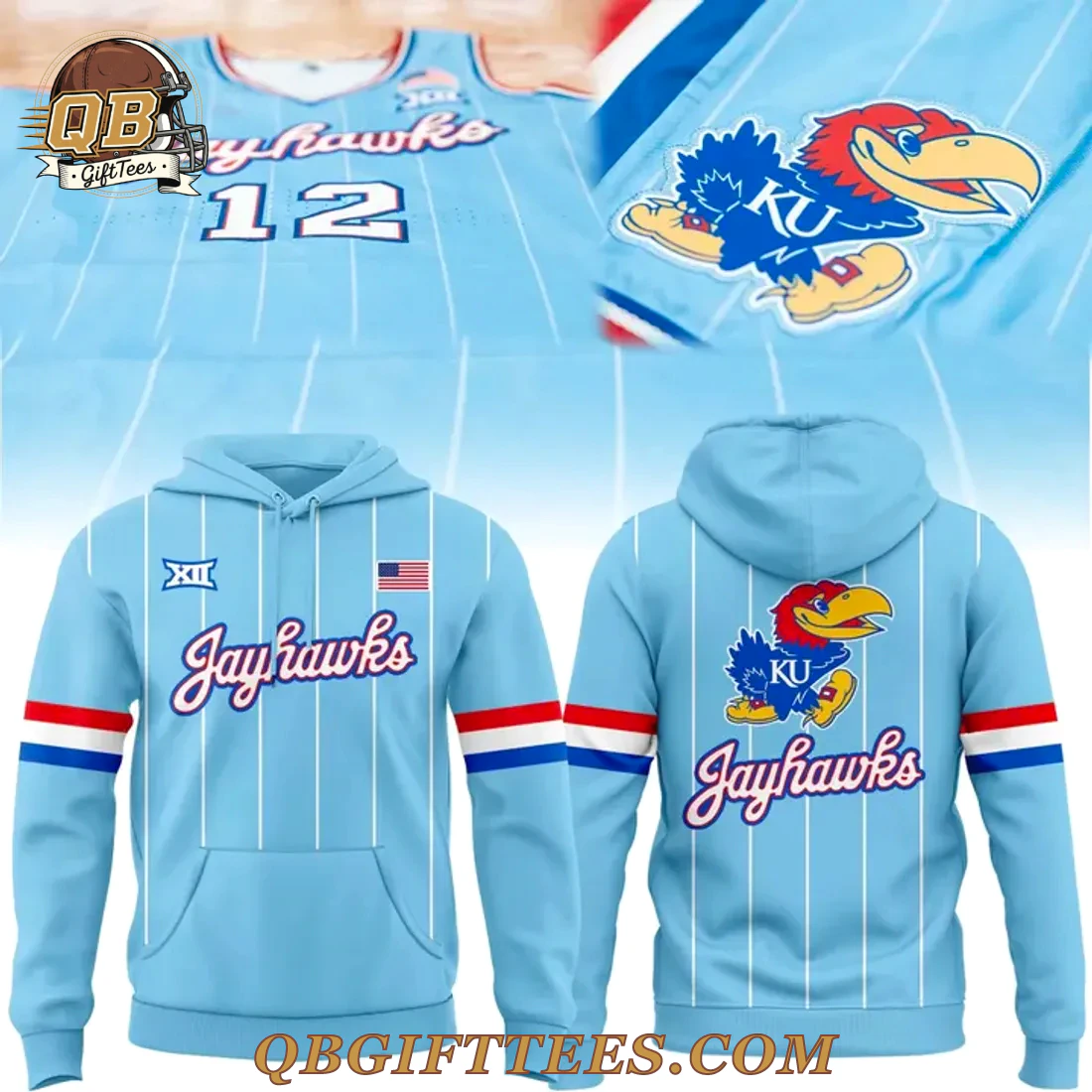 For fans deeply connected to the legacy and spirit of Kansas Women’s Basketball, the Kansas Jayhawks Women Basketball Uniforms Edition Hoodie offers an authentic way to showcase unwavering pride. This hoodie features a light blue base adorned with classic white vertical pinstripes, mirroring the beloved uniform aesthetic. The front proudly displays “Jayhawks” in a distinctive red script with a white outline, centered above a spacious kangaroo pocket. A “XII” (Big 12 Conference) logo is positioned on the left chest, complemented by an American flag patch on the right. The sleeves are accented with crisp red, white, and blue stripe details on the cuffs, while a matching drawstring hood completes the design. On the back, the iconic Jayhawk mascot, rendered in full vibrant color, is prominently displayed above another “Jayhawks” script, maintaining the uniform-inspired pinstripe background. This hoodie is crafted from a premium polyester blend fabric, offering a comfortable mid-weight construction ideal for everyday wear and robust durability.