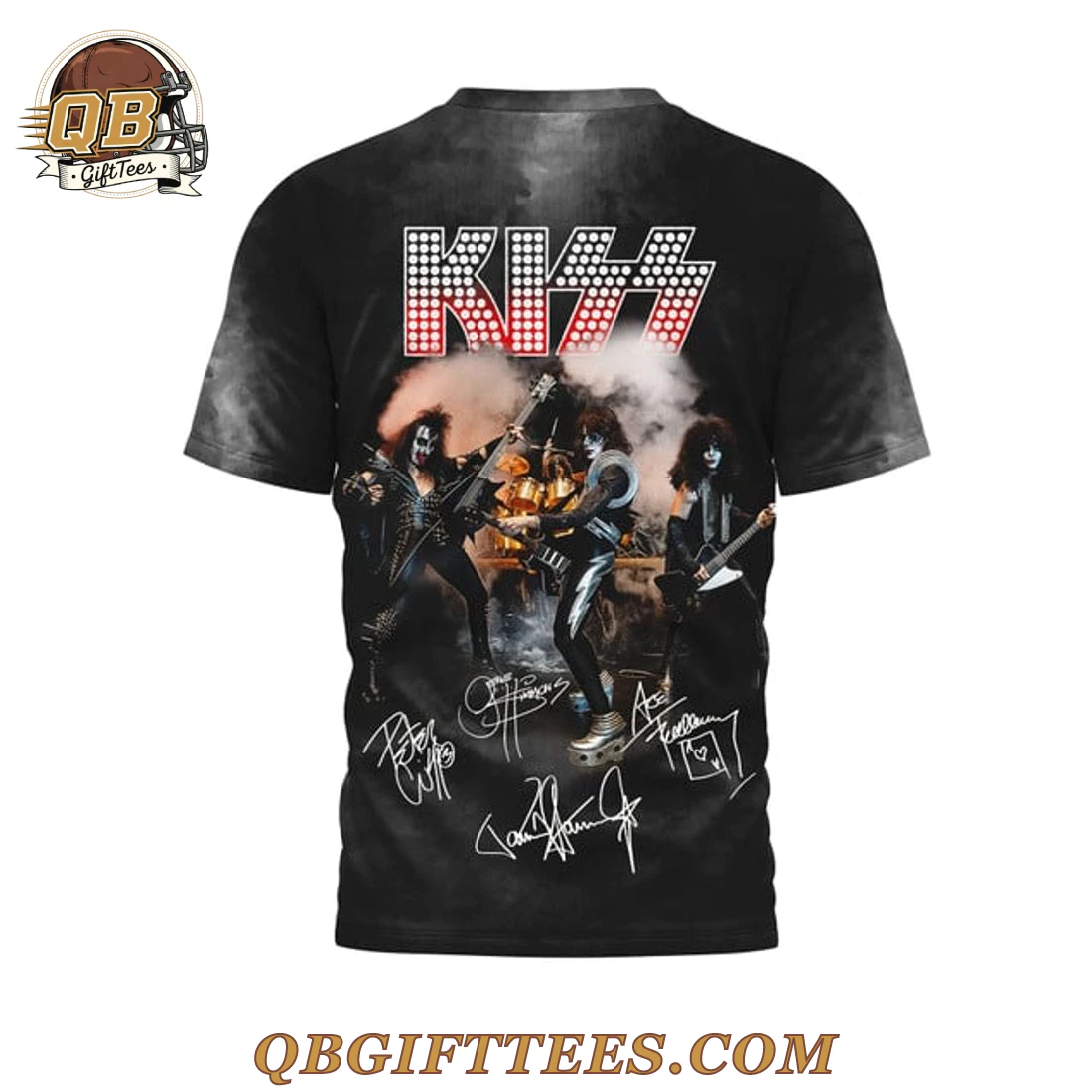 The KISS Limited Edition T-Shirt offers fans a wearable piece of rock history, celebrating the iconic band’s electrifying live presence that defined a generation. This garment connects you directly to the raw energy and spectacle that only KISS can deliver. The front of the tee features the bold “KISS” logo, rendered in a distinctive red dotted gradient, positioned above the classic “ONE: TWO: THREE: FOUR:” tracklist from their legendary Alive! album, with “ALIVE!” prominently displayed in crisp white lettering. The entire design is set against a dynamic black and grey background, giving a subtle tie-dye or smoke-effect appearance. The back of this KISS Limited Edition T-Shirt showcases an action-packed image of Gene Simmons, Paul Stanley, Ace Frehley, and Peter Criss performing live on stage amidst a theatrical smoke effect, topped by the same red dotted “KISS” logo. Below the band image, several replicated signatures are visibly integrated into the design. Crafted from 100% polyester fabric, this t-shirt provides a lightweight and durable feel, ensuring vibrant print quality. It features a standard fit and is designed for comfortable wear.