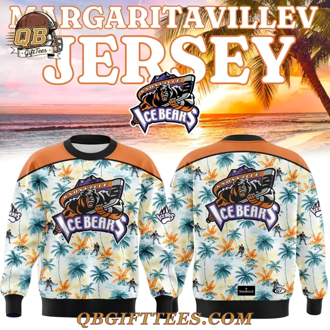 The Knoxville Ice Bears Margaritaville Night 2026 Edition Hoodie brings together the spirited energy of Knoxville hockey with the relaxed vibes of a tropical getaway, perfect for fans who embrace both the roar of the rink and the call of the beach. This eye-catching hoodie features a vibrant, full-sublimation print across the body and sleeves, depicting a serene tropical landscape with palm trees and subtle silhouettes of hockey players interspersed within the pattern. Dominating the front and back is the iconic Knoxville Ice Bears logo, showcasing the fierce bear mascot holding a hockey stick, set against a shield with “Knoxville” and “Ice Bears” lettering in their distinctive purple and orange hues. The hoodie is accented with contrasting solid orange shoulder panels that extend to the upper back, complemented by a black hood lining, drawstring, ribbed cuffs, and hem. Crafted from a soft-touch polyester blend fabric, this hoodie offers a comfortable, mid-weight feel suitable for diverse climates, designed for a standard athletic fit.