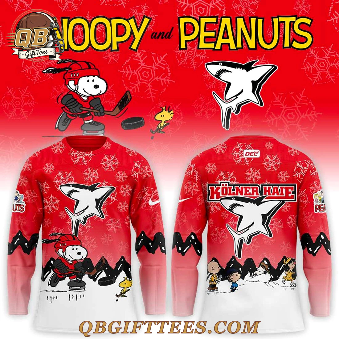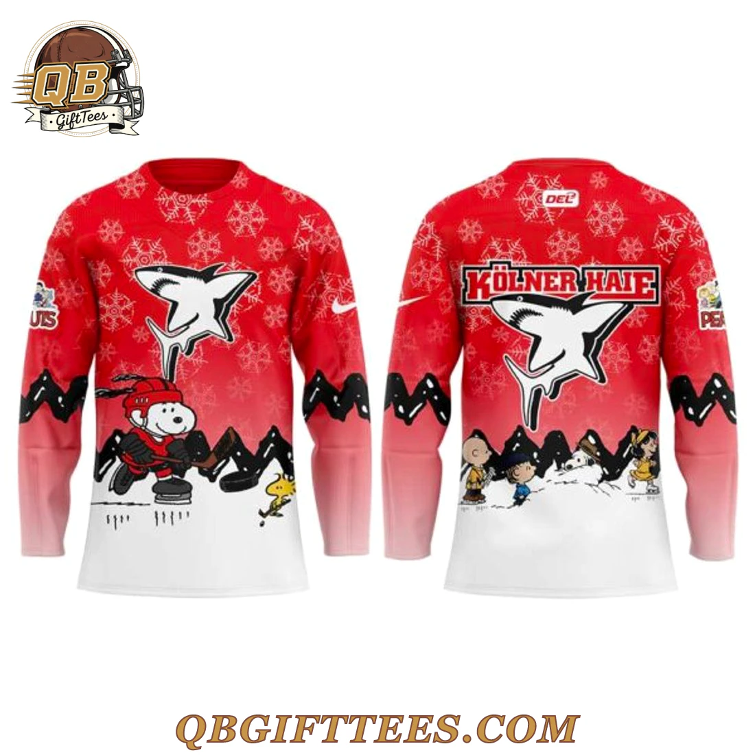 Celebrating the unique fusion of German ice hockey passion and beloved cartoon nostalgia, the Kolner Haie x Snoopy and Peanuts Edition Jersey is a special tribute for fans of all ages. This eye-catching jersey features a vibrant red base that softly transitions to white on the lower body and sleeves, patterned throughout with delicate white snowflakes, evoking a festive winter atmosphere. The front proudly displays the iconic Kolner Haie shark logo, positioned above a charming illustration of Snoopy in full hockey gear, stick in hand, ready to play alongside Woodstock. A distinctive black zig-zag graphic adds a modern touch to the lower section. On the back, the DEL logo sits above the bold “KÖLNER HAIE” text, accompanied by the shark logo and a delightful scene depicting Charlie Brown, Lucy, Linus, and Sally enjoying a snowy landscape. Small collaborative logos are visible on the sleeves, including a swoosh. Crafted from durable 100% polyester fabric, this jersey offers a comfortable, standard fit and is designed for vibrant, lasting graphic quality through advanced sublimation printing.