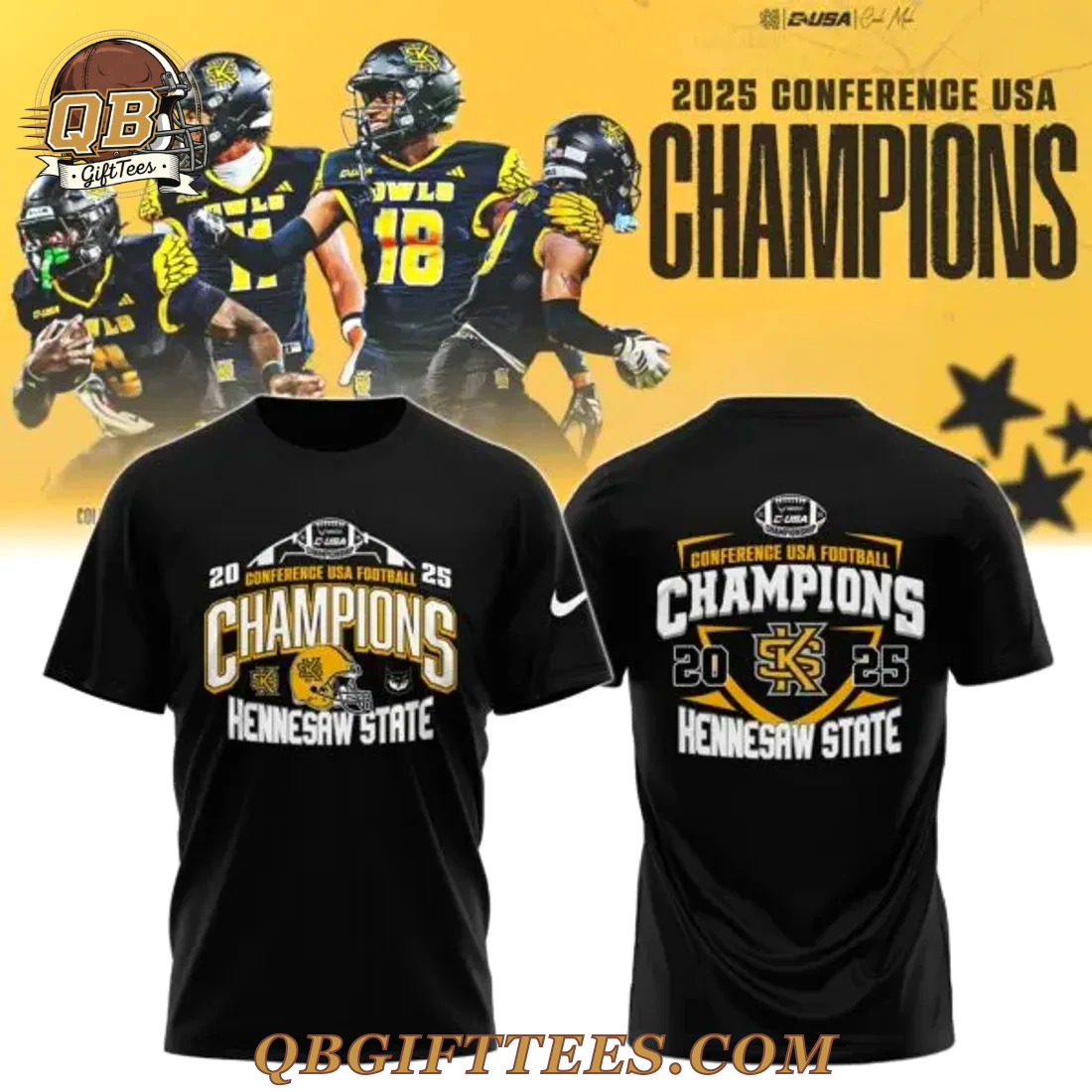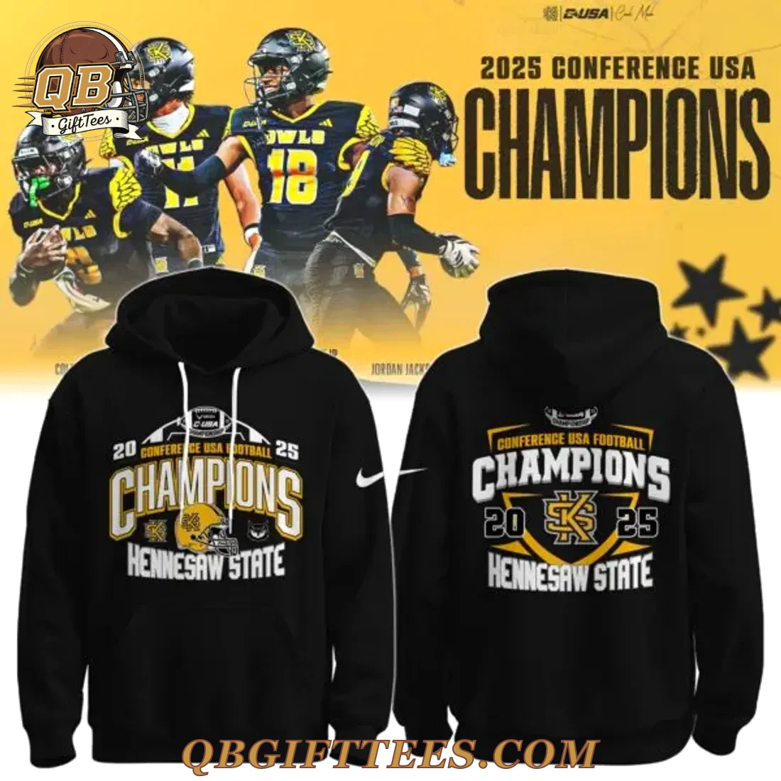 Celebrate Kennesaw State’s ambition and future success with the KSU Conference Champs Garment-Dyed Heavyweight Edition Hoodie. This hoodie represents the spirit and hopes of every Owl fan looking forward to monumental achievements. The front proudly displays “2025 CONFERENCE USA FOOTBALL CHAMPIONS” with “CHAMPIONS” in a striking gold font, accompanied by the iconic KSU helmet graphic and “Hennesaw State” below. A visible swoosh is featured on the wearer’s left sleeve. The reverse side reinforces this message, showcasing “CONFERENCE USA FOOTBALL CHAMPIONS” above a prominent “CHAMPIONS” in white, flanked by “20” and “25” with the KSU logo centrally replacing the “2”, and “Hennesaw State” at the bottom. Crafted as a garment-dyed heavyweight edition hoodie*, this piece offers a substantial feel and rich color, typically a durable cotton blend designed for lasting comfort.