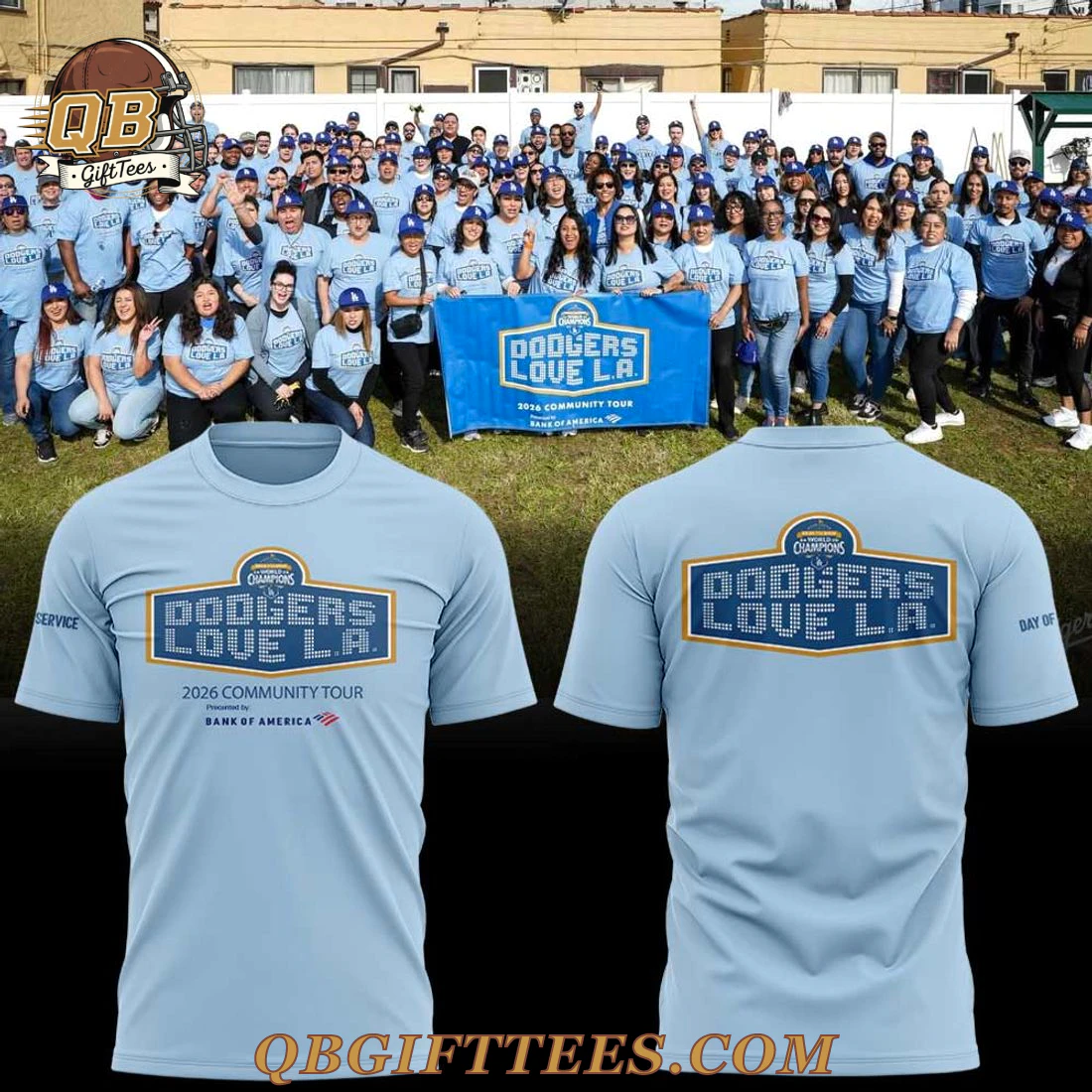 For Dodgers fans, the LA Dodgers Love LA Community Tour Limited Edition Hoodie embodies the deep connection between the team and its community, celebrating shared spirit beyond the stadium. This light blue pullover hoodie features a prominent graphic on the front: “CHAMPIONS” arched over a rectangular emblem with “DODGERS LOVE L.A.” in white and gold text, set within a dark blue border with a gold dotted outline. Below this, “2026 COMMUNITY TOUR” and the “BANK OF AMERICA” logo are displayed. The left sleeve features “SERVICE” in white. The back of the hoodie showcases a larger rendition of the “CHAMPIONS” and “DODGERS LOVE L.A.” emblem, while the right sleeve reads “DAY OF” in white. Constructed from a premium 80% cotton, 20% polyester blend, this mid-weight fleece hoodie offers both comfort and durability. The fabric’s density, approximately 8.5 oz/yd² (280 g/m²), ensures a soft feel and reliable warmth, making it suitable for various fan activities.