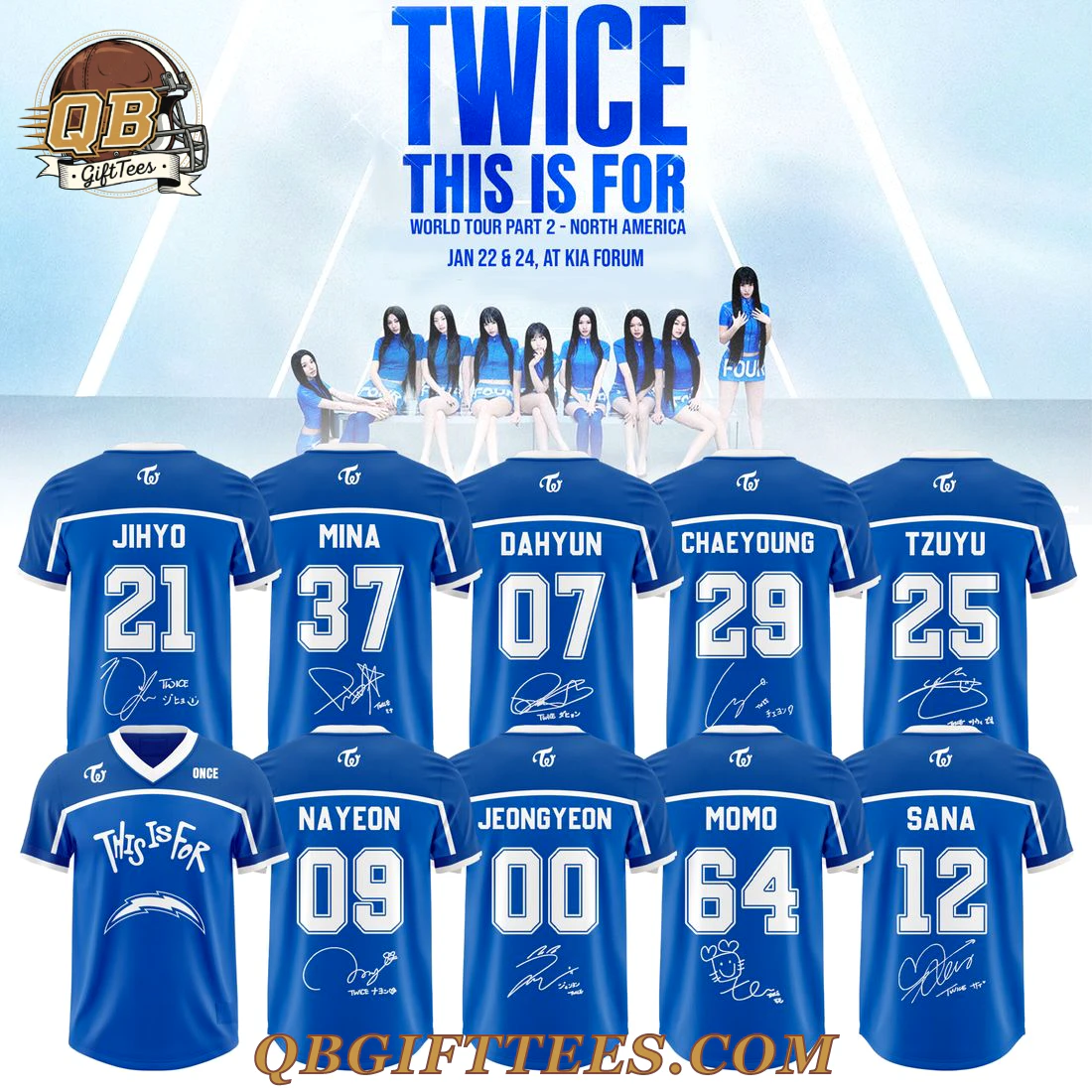 TWICE fans: Los Angeles Chargers x TWICE THIS IS FOR WORLD TOUR PART II 2025 Edition Football Jersey. Features Chargers bolt. Show loyalty. Get it….