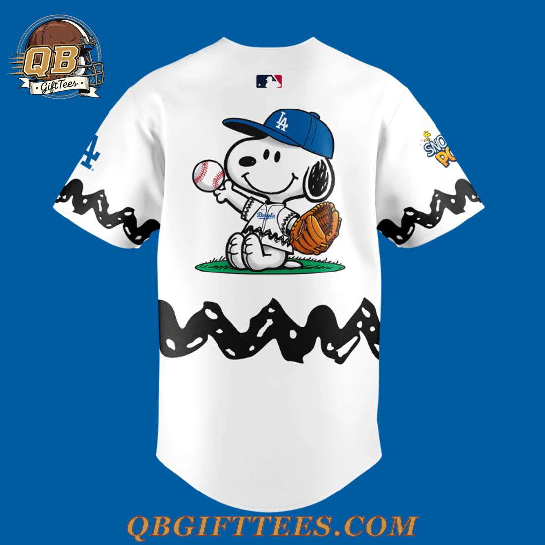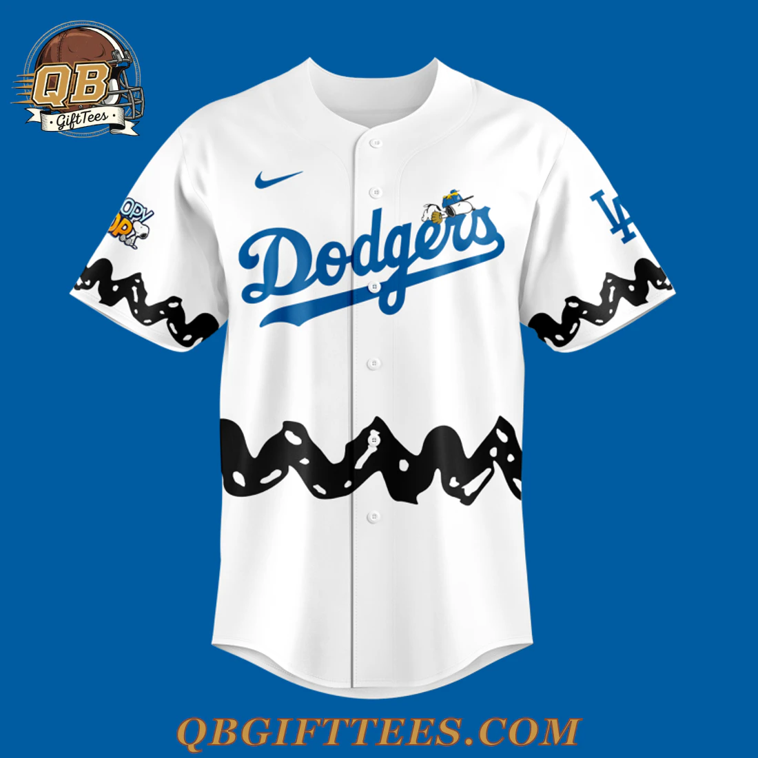 The Los Angeles Dodgers x Peanuts Night 2026 Baseball Jersey offers a unique blend of timeless baseball tradition and cherished Peanuts charm, appealing to generations of fans. This white, full-button jersey features the iconic blue “Dodgers” script across the chest, with Snoopy depicted mid-flight, wearing a blue cap, subtly placed above the ‘g’ in the team name. A blue swoosh is embroidered on the right chest. The left sleeve proudly displays the classic blue “LA” logo, complemented by an image of Snoopy swinging a bat below it. On the right sleeve, a circular ‘Snoopy’s Pal’ emblem adds to the collaborative spirit. The lower hem of the jersey on both the front and back is adorned with a distinctive black, wavy pattern, instantly recognizable as Charlie Brown’s signature zig-zag. The back of the jersey showcases a large, vibrant graphic of Snoopy in a blue Dodgers cap, seated on green grass with a baseball and glove, beneath an official MLB logo at the neck. Constructed from durable, lightweight 100% polyester fabric, this jersey is designed for a comfortable, breathable fit, typically weighing approximately 7 oz.