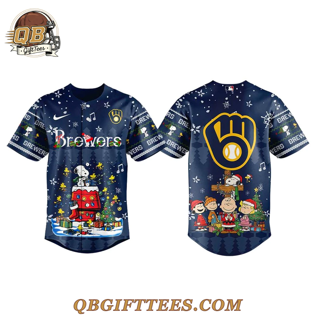 Celebrate the holiday spirit with the M Brewers x Snoopy and Friends Christmas Day Jersey, a unique collectible for fans who cherish both Brewers baseball and the timeless charm of Peanuts. This festive jersey features a deep navy blue base, adorned with a wintry landscape of falling snow, musical notes, and frosted evergreen trees. The front proudly displays “Brewers” in a snow-effect font across the chest, complemented by the iconic Brewers glove logo and a yellow swoosh above. Below, Snoopy sits atop his classic red doghouse amidst decorated presents and a Christmas tree, bringing a touch of holiday joy. The sleeves showcase a repeated “BREWERS” text pattern with decorative zig-zag cuffs. The back prominently features the larger yellow Brewers glove logo, with Charlie Brown and the Peanuts gang gathered in a heartwarming snowy scene. Crafted from a lightweight, breathable polyester knit fabric, this jersey offers a comfortable, athletic fit, designed for everyday wear or game day celebrations.
