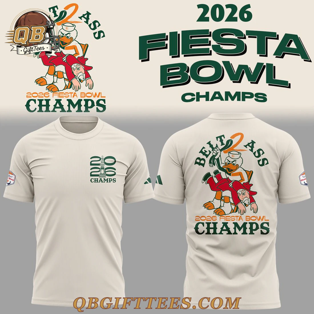 This Miami Hurricanes 2026 Fiesta Bowl Champions Hoodie celebrates the imagined triumph, allowing fans to boldly display their enduring spirit and unwavering belief in the Canes. Crafted from a durable blend of 80% cotton and 20% polyester fleece, this hoodie offers a comfortable yet sturdy feel, weighing approximately 8.5 oz/yd² (280 gsm) suitable for various climates. The garment features a standard fit with ribbed cuffs and hem, a double-lined hood with an adjustable drawstring, and a front kangaroo pocket. The base color is a neutral cream. On the front, a prominent dark green “2026” graphic is centered, with a detailed championship trophy emblem replacing the ‘0’. Below this, “CHAMPS” is rendered in matching dark green. The left sleeve features a small, circular emblem with a football and the word “CHAMPS” inside, while the right sleeve displays the logo in dark green. The back of the hoodie showcases a unique graphic featuring an angry duck character, in white and orange, holding a belt above a prone figure in a red hat. Above this imagery, “BELT 2 ASS” is displayed in dark green with an orange ‘2’. Beneath the graphic, “2026 FIESTA BOWL CHAMPS” is written in dark green, with “2026 Fiesta Bowl” in orange. The printing technique utilizes screen printing for crisp, long-lasting graphics.