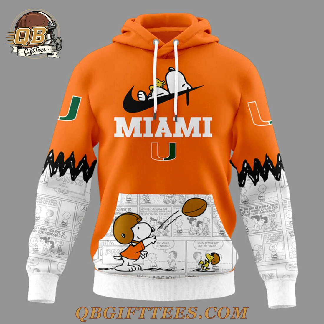Celebrate your Hurricanes pride with a touch of classic Peanuts charm in the Miami Hurricanes x Snoopy Peanuts Limited Edition Hoodie. This vibrant orange hoodie makes a genuine connection, blending legendary team spirit with beloved comic strip nostalgia for fans across generations. The front of this unique Miami Hurricanes x Snoopy Peanuts Limited Edition Hoodie features Snoopy playfully resting on a black swoosh, accompanied by bold “MIAMI” lettering and a subtle orange and green ‘U’ logo. A functional kangaroo pocket showcases Snoopy in a football helmet mid-throw against a background of iconic Peanuts comic strips. The back proudly displays a large orange ‘U’ with a green interior, beneath which a lively scene unfolds with various Peanuts characters in football gear, set against more comic panels and a distinctive black zigzag pattern. The sleeves combine the primary orange hue with detailed black and white comic strip graphics, culminating in clean white cuffs. Crafted from a soft, durable polyester-blend fabric, this hoodie offers vibrant print quality and is designed for comfortable, everyday wear.