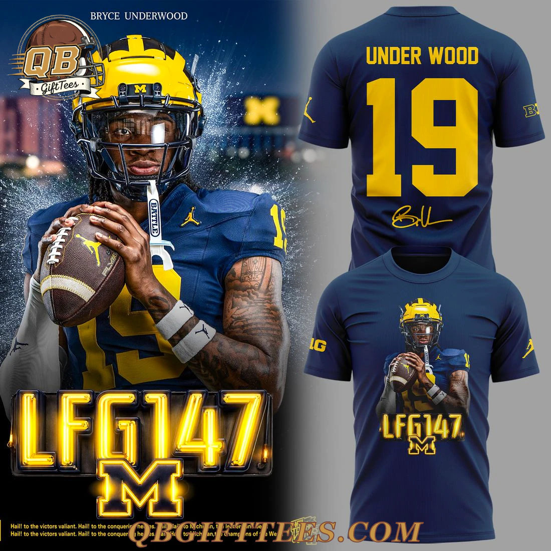For fans deeply invested in the future of Michigan Wolverines football, the Michigan Wolverines Underwood 2026 T-Shirt offers a genuine way to celebrate emerging talent. It unites supporters across diverse demographics, from alumni to new students, all sharing a common anticipation for the next era of champions. This t-shirt features a dynamic front graphic of Bryce Underwood in his full Michigan Wolverines uniform and helmet, holding a football with an intense gaze. Below the player image, the phrase “LFG147” is displayed in bold, illuminated text, followed by the classic Block M logo. The shirt itself is a rich navy blue, consistent with Michigan’s iconic colors. The back design prominently features “UNDER WOOD” in bold maize yellow across the shoulders, with the number “19” in the same vibrant yellow directly beneath. A simulated signature, “Bill,” is also visible below the number. Subtle branding includes a Jumpman logo on the left sleeve and a small Block M on the right sleeve. Crafted from a lightweight, breathable performance blend fabric, often comprising 100% polyester, this t-shirt is designed for comfort and durability. It features a smooth, athletic finish, typically weighing around 4.5 oz/yd², offering a soft feel while being resistant to wrinkles and shrinking.