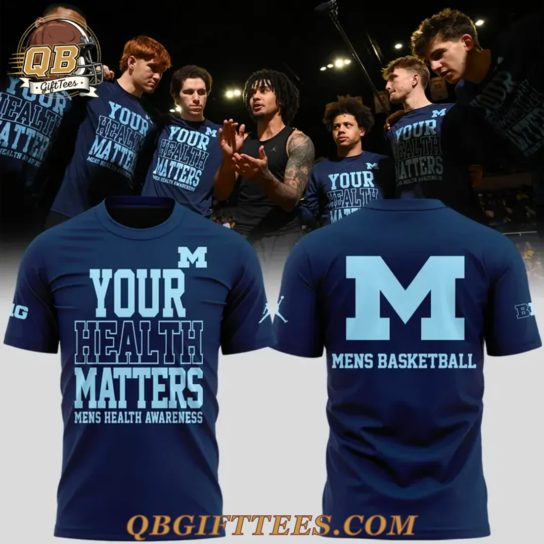 The Michigan Wolverines Your Health Matters Limited Edition T-Shirt offers fans a meaningful way to support both their beloved team and an important cause. This garment represents the collective spirit of the Michigan Wolverines community, uniting diverse fans around a shared commitment to well-being. The dark navy blue short-sleeve T-shirt features a prominent light blue “M” block logo at the top center on the front, beneath which the phrase “YOUR HEALTH MATTERS” is boldly displayed in stacked, light blue, block lettering. Below this, “MENS HEALTH AWARENESS” is presented in smaller, complementary light blue text. The left sleeve proudly carries the white and light blue Big Ten Conference logo, while the right sleeve showcases the iconic white and light blue Jumpman logo. Turning to the back, a large light blue “M” block logo is centered, accompanied by “MENS BASKETBALL” in light blue block letters below it. Crafted from a soft, breathable performance blend fabric, this T-shirt is designed for comfortable wear.