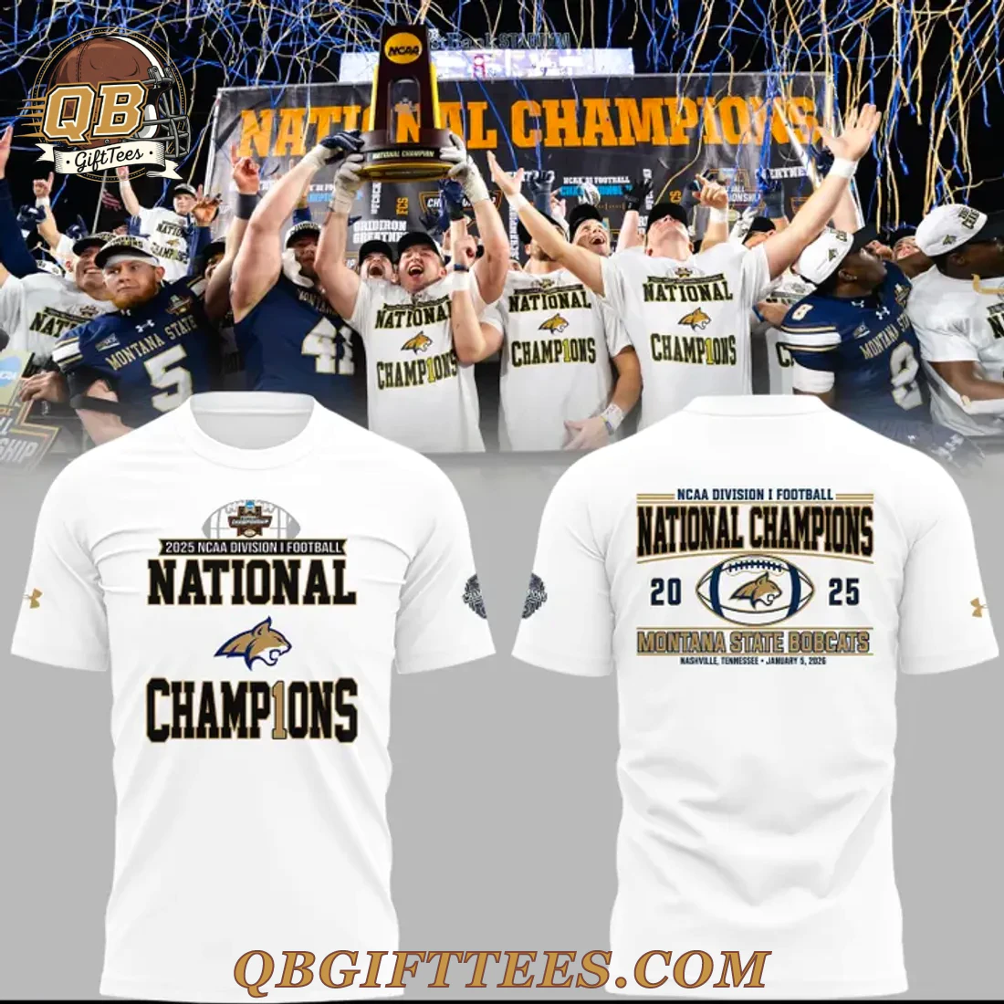 The Montana State Bobcats National Champions Limited Edition Hoodie offers fans a tangible way to express their pride and anticipation for a dominant future. This commemorative piece unites supporters across all demographics in celebrating the spirit of their team’s potential. The crisp white hoodie features a prominent design on the front: “2025 NCAA Division 1 Football” text above “NATIONAL” in bold black, followed by the distinctive Montana State Bobcats head logo, and “CHAMPIONS” in black with a striking gold “1” replacing the ‘I’. A circular black patch with a white ‘B’ and text is visible on the left sleeve. The reverse side proudly displays “NCAA Division 1 Football” and “NATIONAL CHAMPIONS” in black, flanked by “20” and “25” with a football featuring the Bobcats logo, all centered above “MONTANA STATE BOBCATS” and “NASHVILLE, TENNESSEE – JANUARY 5, 2026”. An Under Armour logo is subtly placed on the upper back, right side. Crafted from a durable and soft-touch polyester-cotton blend, this mid-weight pullover hoodie features a comfortable hood with adjustable drawstrings, a spacious front kangaroo pocket, and ribbed cuffs and hem for a secure fit.
