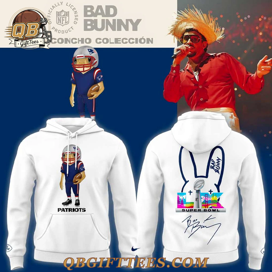 Showcase your Bad Bunny and Patriots passion. NE Patriots x Bad Bunny White Hoodie features the Super Bowl back graphic. Enjoy comfy fan expression. Get yours….