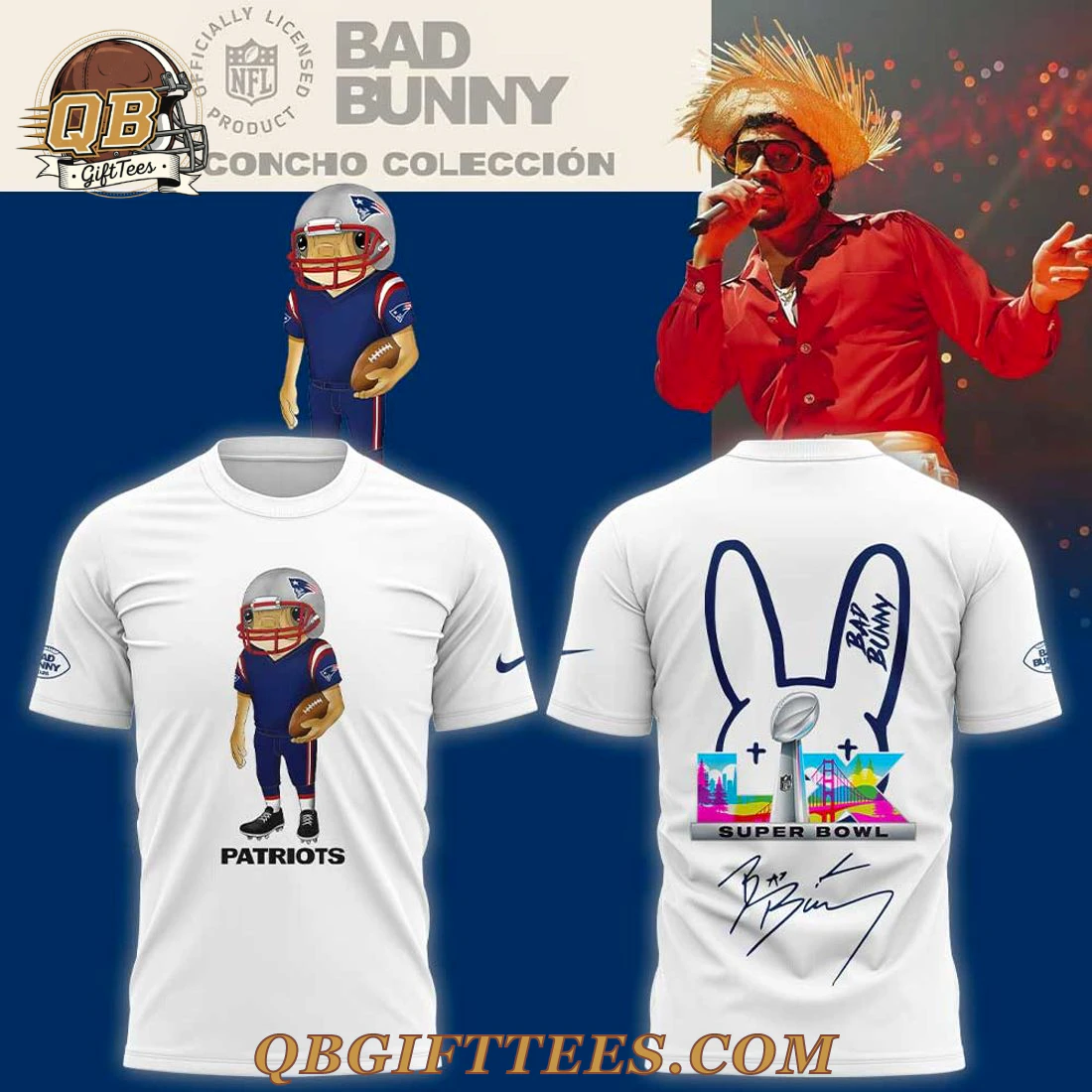 Celebrate the unique intersection of NFL fandom and global music artistry with the NE Patriots x Bad Bunny White Hoodie. This apparel piece appeals to fans who appreciate both high-energy sports and groundbreaking music culture. The pullover hoodie features a clean white base, presenting a front graphic of a stylized cartoon football player fully equipped in a New England Patriots uniform, helmet, and holding a football. The word “PATRIOTS” is prominently displayed below this illustration. The reverse side showcases a bold, outlined Bad Bunny bunny head logo, with “BAD BUNNY” text running vertically along the right ear. Beneath the logo, a Super Bowl trophy is centered amidst a vibrant, multi-colored geometric landscape, with “SUPER BOWL” text below and a reproduced Bad Bunny signature. Small swooshes are visible on the left cuff and upper back. Crafted from a durable 80/20 cotton-polyester blend fleece, this mid-weight hoodie typically features a fabric weight of around 8.0 oz/yd² (270 g/m²), designed for a relaxed fit and lasting comfort.