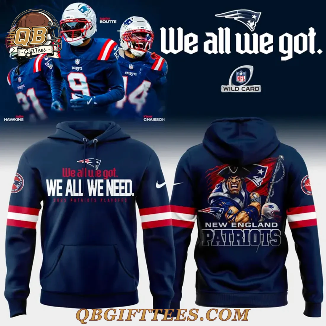 For New England Patriots fans, the New England Patriots We all we got Limited Edition T-Shirt embodies the enduring spirit of collective strength and unwavering belief, a sentiment that resonates through every season regardless of the outcome. This comfortable, short-sleeve crew neck t-shirt features a deep navy blue base, reflecting the team’s primary colors. The front prominently displays “We all we got.” in white, centered above the bold red text “WE ALL WE NEED.” Below this powerful slogan, “2023 PATRIOTS PLAYOFFS” is printed in white. The modern New England Patriots “flying Elvis” logo is visible on the left sleeve, complemented by the swoosh on the right sleeve. The reverse side features a detailed graphic of the classic “Pat Patriot” emblem, depicting the steadfast Minuteman warrior holding a musket with a Patriots flag, symbolizing the team’s heritage. Below this iconic artwork, “NEW ENGLAND” appears in a white, distressed font, with “PATRIOTS” in a larger, distressed silver-white font. This t-shirt is constructed from a high-quality, breathable fabric blend, known for its comfort and lasting wear.
