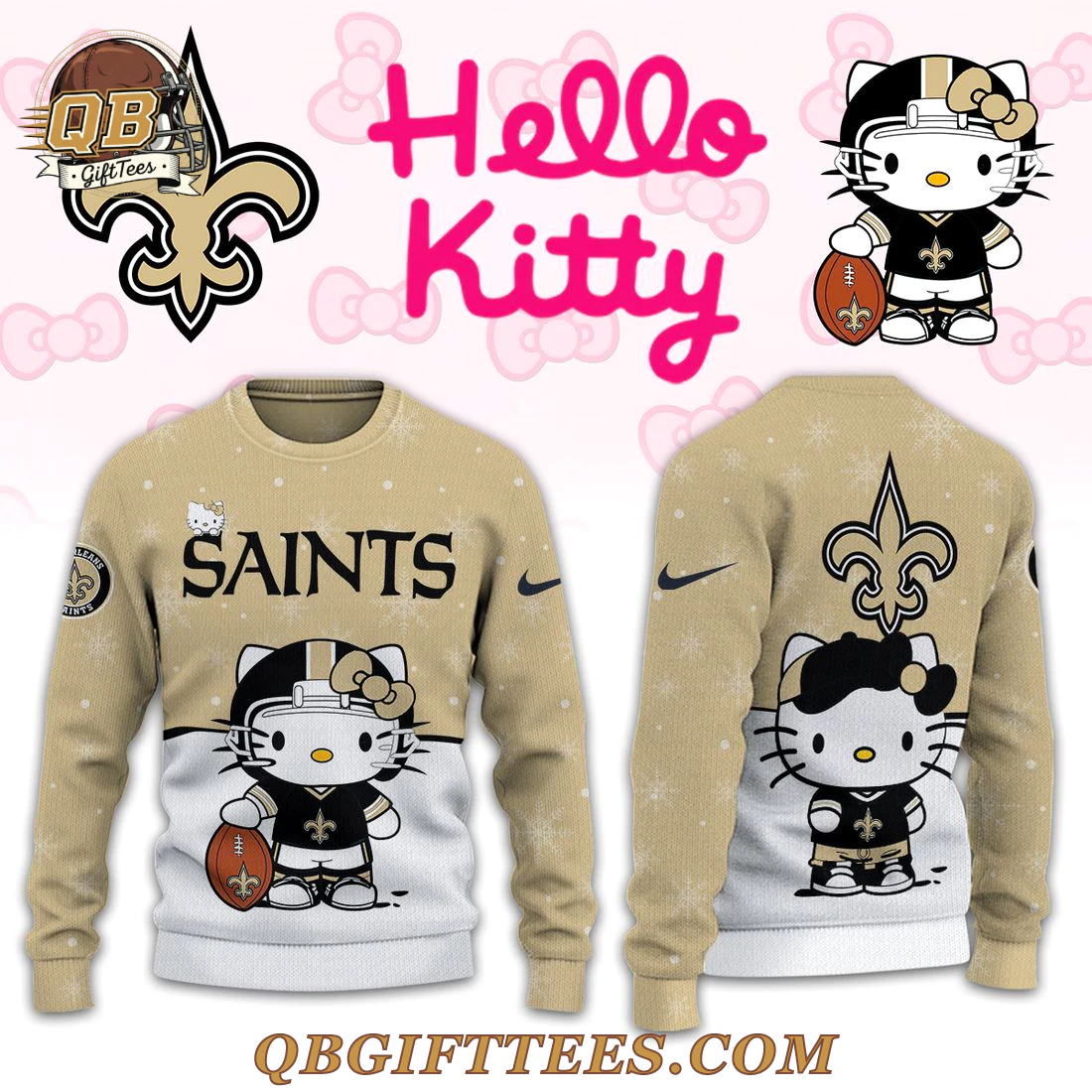 For fans who love to celebrate their team spirit with a touch of playful charm, the New Orleans Saints x Hello Kitty Limited Edition Ugly Sweater brings together two iconic worlds. This festive pullover sweater features a two-tone design, with a gold-tan upper half and a crisp white lower section. The gold-tan portion is adorned with white snowflake motifs, a small Hello Kitty figure on the left chest above “SAINTS” in bold black lettering, and a black swoosh on the left sleeve. The white lower half prominently displays Hello Kitty dressed in a New Orleans Saints football uniform, complete with a gold and black helmet, a black jersey featuring a gold fleur-de-lis, and holding a brown football also decorated with a gold fleur-de-lis. The back mirrors this two-tone aesthetic; the gold-tan upper section features a large, stylized Saints fleur-de-lis logo and a swoosh on the left sleeve, while the white lower section displays Hello Kitty in her Saints uniform, sans helmet. This sweater is constructed from a medium-weight knitted polyester blend fabric, offering comfort and durability, finished with ribbed cuffs and hem for a snug fit.