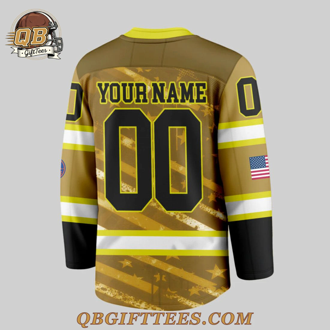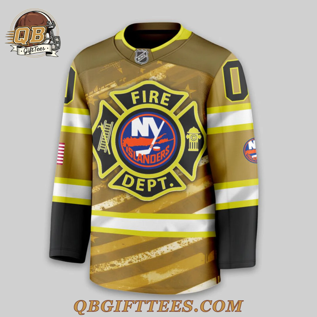 For dedicated New York Islanders fans, this New York Islanders Fire Dept Personalized Hockey Jersey embodies a profound connection to both their beloved team and the unwavering bravery of first responders. Its design features a rich, deep tan/gold primary color, reminiscent of fire service gear, complemented by striking black shoulder yokes and sleeves. Prominently centered on the front is a black Maltese cross emblem, declaring “FIRE DEPT.” with the iconic New York Islanders logo nestled within. This emblem is detailed with an axe and ladder on the left and a fire hydrant on the right. White and yellow stripes horizontally band the arms and lower body, echoing traditional jersey aesthetics, while a subtle, distressed pattern of stars and stripes adds texture to the tan/gold background. The back proudly displays “YOUR NAME” and “00” in bold black, outlined in yellow, against the same textured background. A small American flag adorns the right sleeve, and the NHL shield is visible at the collar. Crafted from a durable, performance polyester knit fabric, this jersey offers both comfort and longevity, with vibrant, sublimated graphics that resist fading.