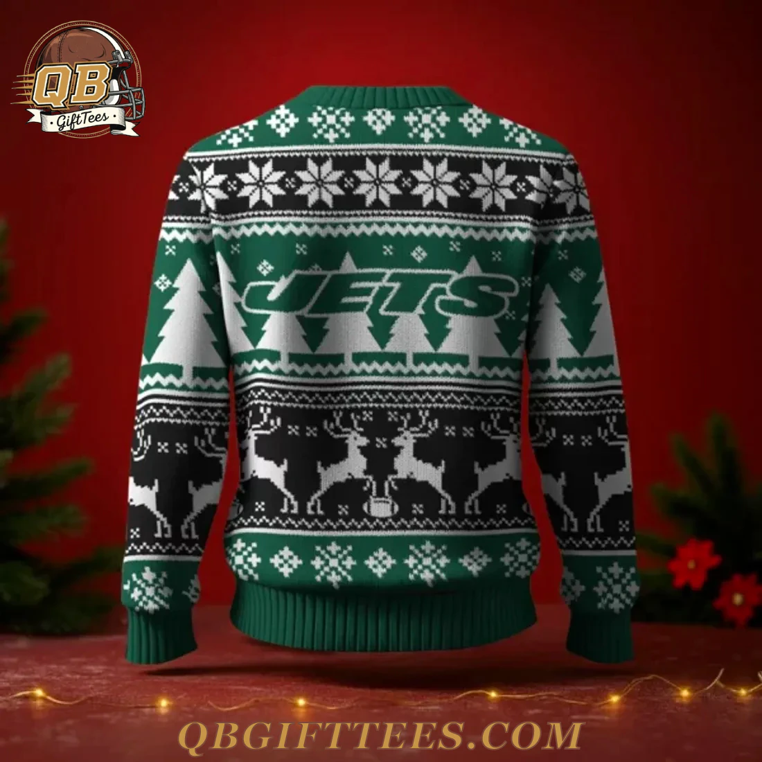 For dedicated fans, the New York Jets 2025 Christmas Ugly Sweater is more than just holiday apparel; it’s a festive statement of team pride, perfect for uniting generations of supporters. This eye-catching crewneck knit sweater features a vibrant green base, intricately patterned with classic holiday motifs and unmistakable Jets branding. The front prominently displays the iconic New York Jets oval logo—white lettering over a green football silhouette—centered amidst white pine trees and a festive snowflake band. Below, a striking black panel showcases a playful pattern of white reindeer. The back mirrors this holiday spirit with the bold “JETS” wordmark positioned above the reindeer motif. Constructed from a premium 100% acrylic knit, this sweater offers a comfortable, standard fit, designed for warmth and lasting wear during the holiday season. The ribbed cuffs and hem ensure a snug, comfortable feel.
