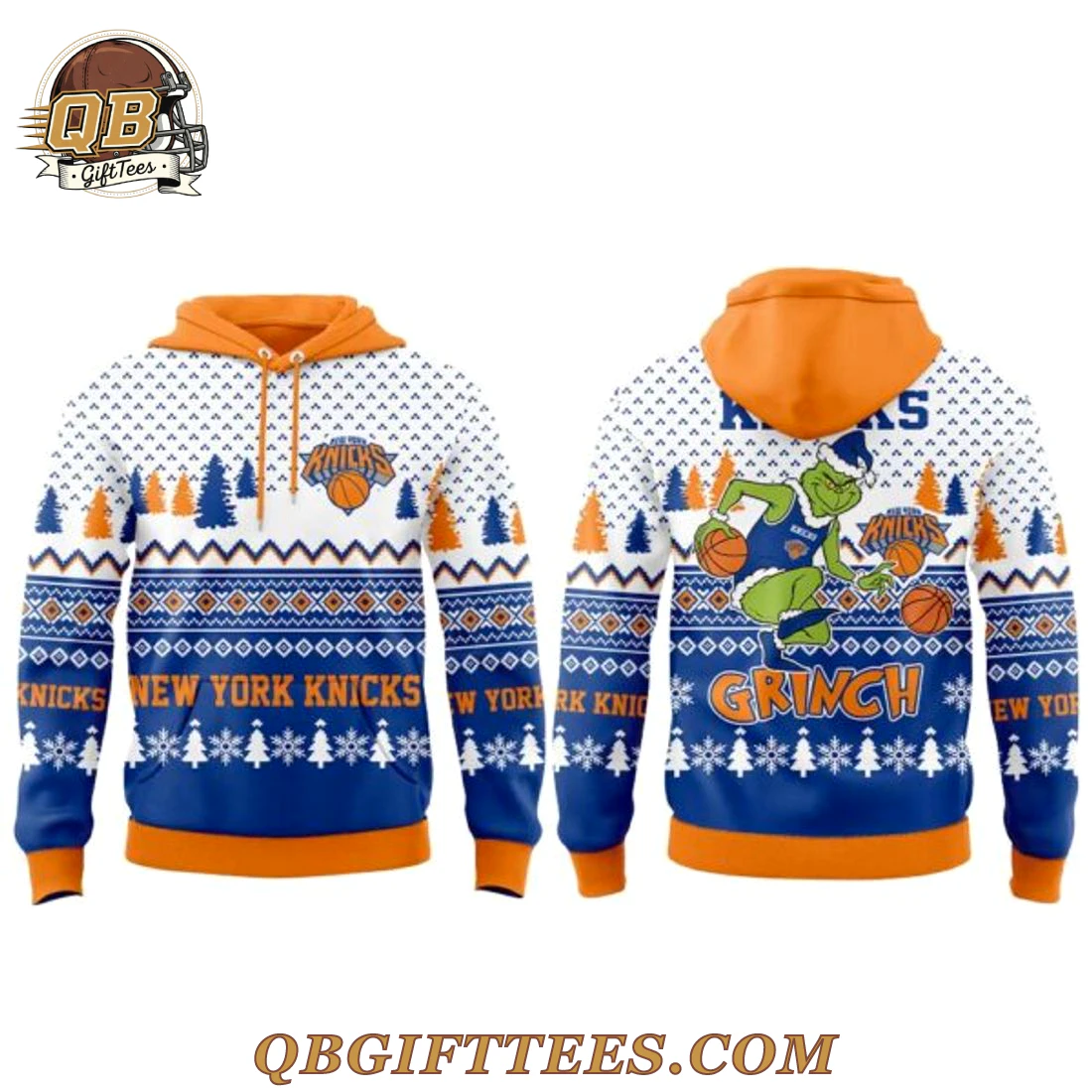 The New York Knicks Christmas Grinch Jumper 2025 Hoodie offers Knicks fans a festive way to celebrate the holiday season while showcasing their team pride. This unique design merges classic holiday cheer with iconic team spirit. The hoodie features an all-over sublimated print on a white background, accented with a repeating pattern of small blue crosses. The hood, cuffs, and hem are rendered in a vibrant orange. Across the chest, a blue and orange fair isle pattern band is visible, topped with the New York Knicks team logo. Below this, a blue band repeats “KNICKS NEW YORK KNICKS” in white lettering, interspersed with white snowflakes and evergreen tree motifs. The reverse side continues the white background and fair isle pattern. It prominently displays a green Grinch character, sporting a New York Knicks jersey and dribbling two basketballs. Below the Grinch, the word “GRINCH” appears in white, flanked by more snowflakes and trees on a blue band. Crafted from a durable polyester blend fabric with a soft fleece interior, this mid-weight hoodie (approximately 280-300 GSM) offers a comfortable, standard fit.