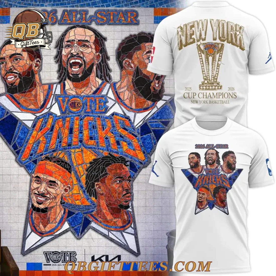 The New York Knicks The ALL-START Limited Edition Hoodie offers a direct connection to the passion and future aspirations of Knicks fans. This essential fan collectible celebrates rising stars and team spirit. The front features a vibrant mosaic-style graphic on a crisp white background. Five prominent New York Knicks players are depicted within a bold star shape, with “2026 ALL-STAR” prominently displayed above and “VOTE KNICKS” across the center. The art style employs distinct segments of blue and orange, creating a dynamic visual effect. The back of the hoodie proudly displays “NEW YORK” in a distressed, golden-textured font above a stylized trophy, adorned with the text “2025 2026 CUP CHAMPIONS” and “NEW YORK BASKETBALL” below. A subtle blue NBA logo is visible on the left sleeve. This hoodie is crafted from a premium cotton-poly fleece blend, ensuring both comfort and durability. It features a mid-weight 8.5 oz/280 GSM fabric and is designed with a classic, relaxed fit, standard body length, and ribbed cuffs and hem for enduring wear.
