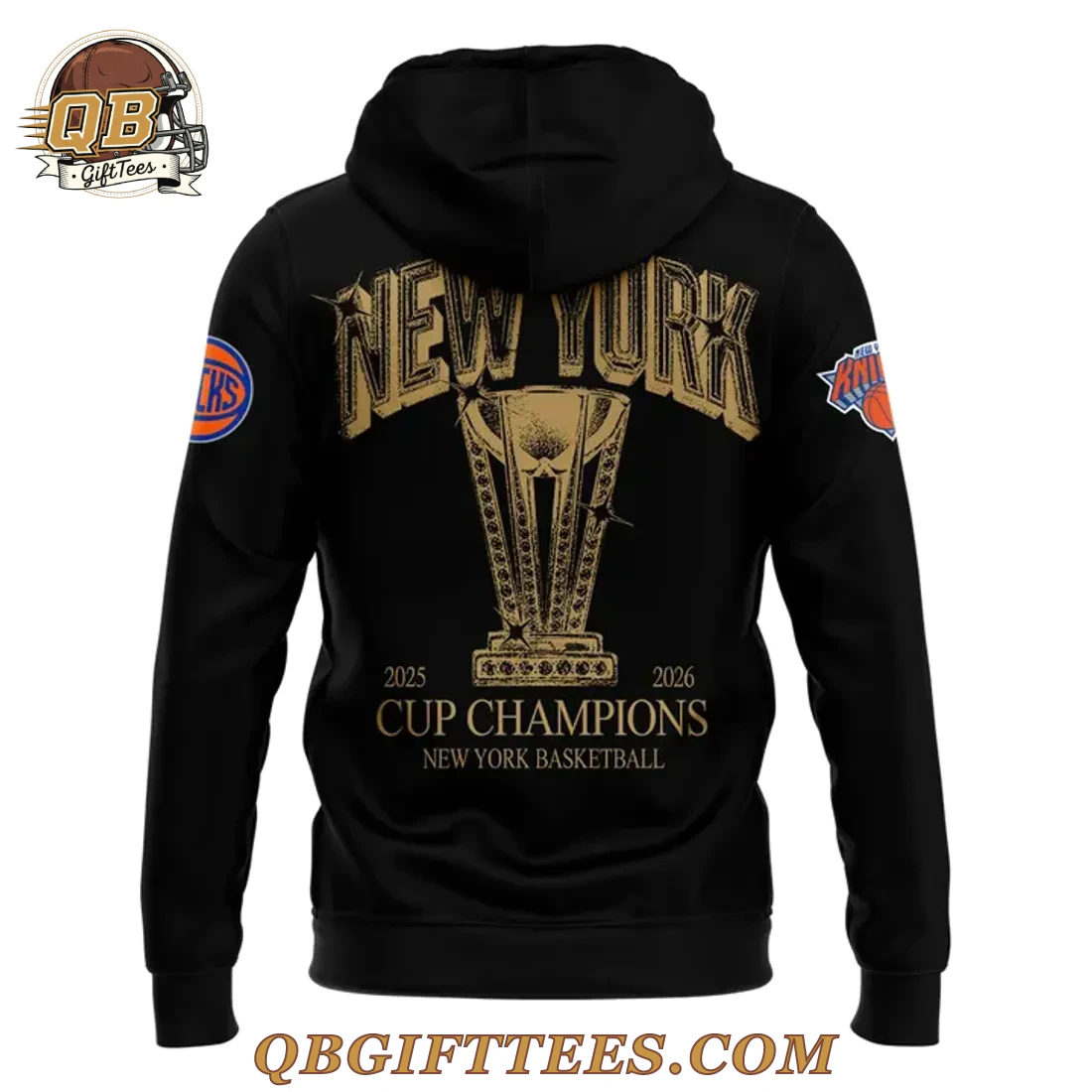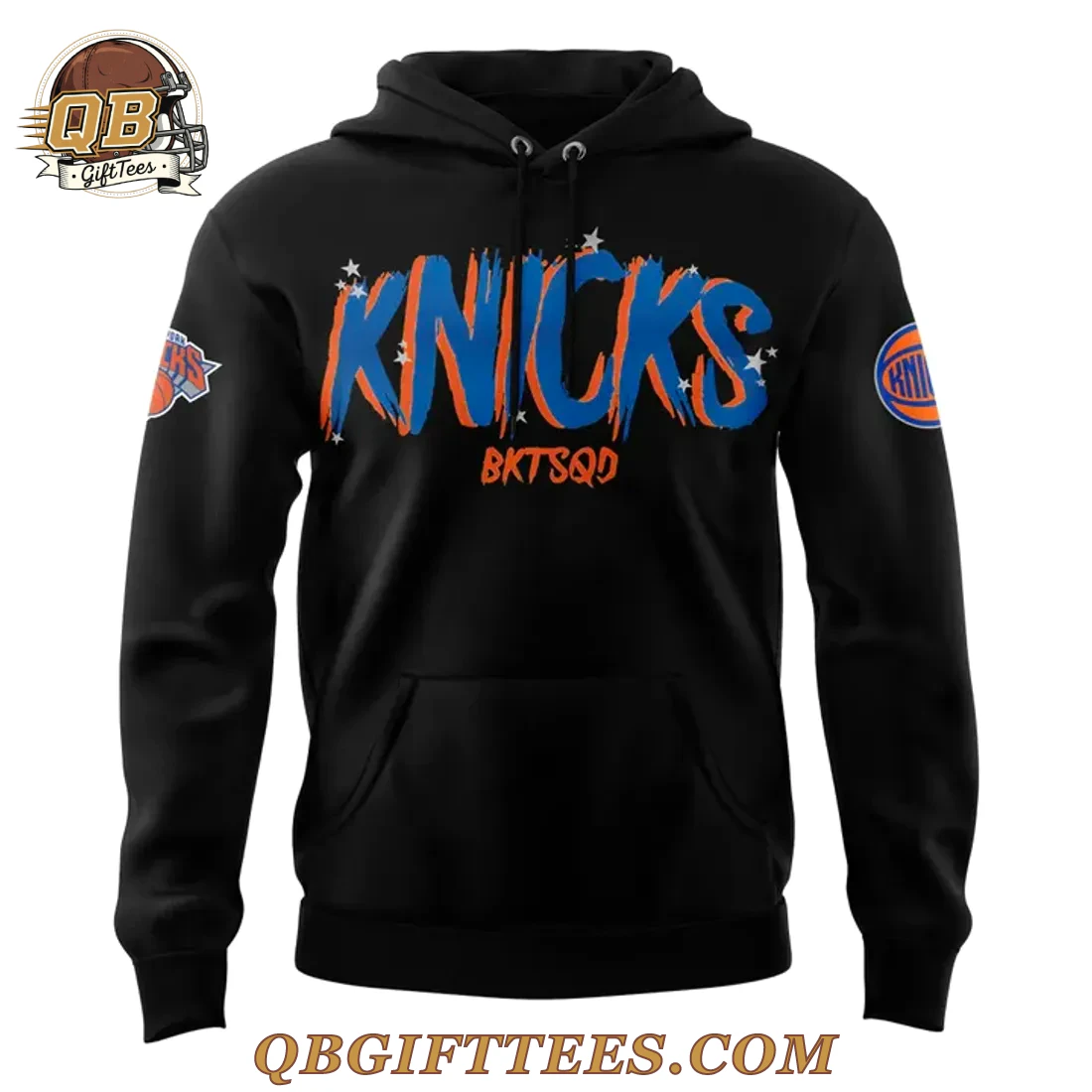 The New York Knicks x Jesser 2025 Edition Hoodie offers fans a unique way to connect with their team’s future aspirations and vibrant spirit. This hoodie features a striking front design with “KNICKS” emblazoned across the chest in a dynamic, brush-stroke style font, colored in the team’s iconic royal blue and orange, accented with scattered white stars. Below this, “BKTSQD” is subtly printed in white. The left and right sleeves proudly display circular New York Knicks logo patches. The reverse of the hoodie showcases “NEW YORK” in a robust, textured gold typeface, positioned above a detailed gold championship trophy graphic. Flanking the trophy base are “2025” and “2026”, with “CUP CHAMPIONS” and “NEW YORK BASKETBALL” detailing a future vision. Crafted from a comfortable and durable mid-weight blend of cotton and polyester fleece, this garment is designed for lasting warmth and features a classic hooded sweatshirt silhouette with a front kangaroo pocket and adjustable drawstrings.