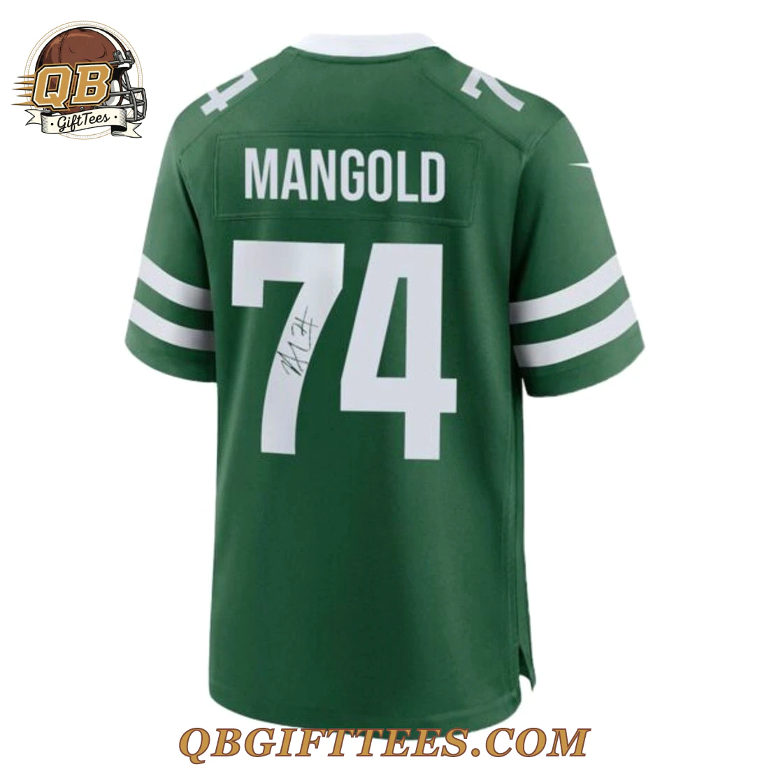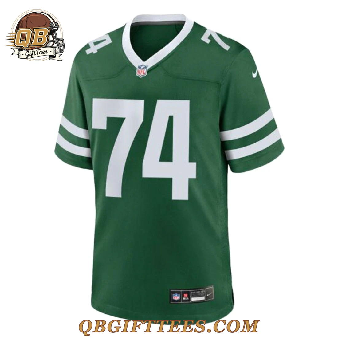 Celebrate the enduring impact of a Jets icon with the NFL Jets Nick Mangold In Memory Legend Jersey. This jersey embodies the spirit and dedication Mangold brought to the field, making it a meaningful item for every generation of New York Jets fans. The design features a deep forest green base, accented by a crisp white V-neck collar. On the front, the bold white number “74” stands prominently. The sleeves are adorned with two distinct white stripes, and a subtle white swoosh is visible on the left sleeve, accompanied by the official NFL shield at the base of the V-neck. The back proudly displays “MANGOLD” across the shoulders above the large white “74,” which is further enhanced by a graphic representation of his signature. Crafted from 100% polyester mesh fabric, this jersey offers a lightweight and breathable feel, consistent with fan apparel designed for comfort and durability.