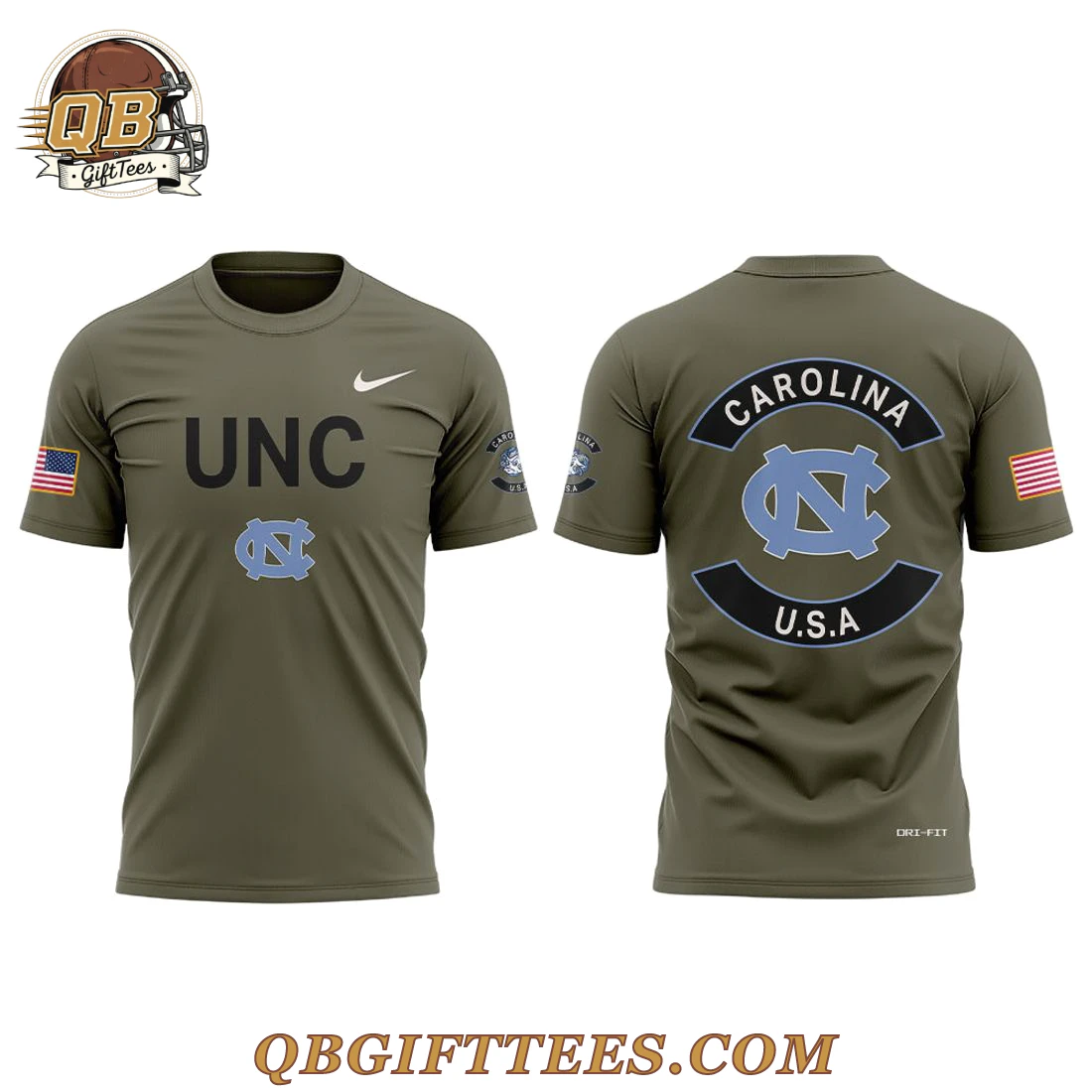 For North Carolina Tar Heels fans who wish to honor both their beloved team and the service of our military, the North Carolina Tar Heels Military Appreciation 2025 Shirt offers a profound symbol of dual pride. This performance tee features a distinct olive green base, evoking a classic military aesthetic. The front proudly displays “UNC” in bold dark lettering, centered above the iconic light blue Tar Heels “NC” logo. A crisp white swoosh is positioned on the upper right chest, while a subdued American flag patch adorns the right sleeve. The back of the shirt features a large, striking emblem with “CAROLINA” arched above the light blue “NC” logo, and “U.S.A.” completing the arc below. A matching American flag patch is prominently featured on the left sleeve. Crafted from lightweight, moisture-wicking polyester fabric, consistent with ‘s Dri-FIT technology, this shirt is designed for comfort and durability.