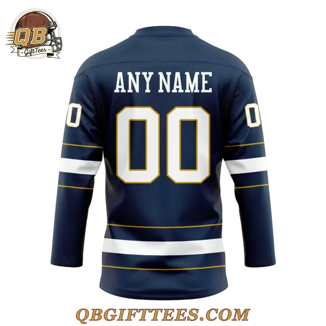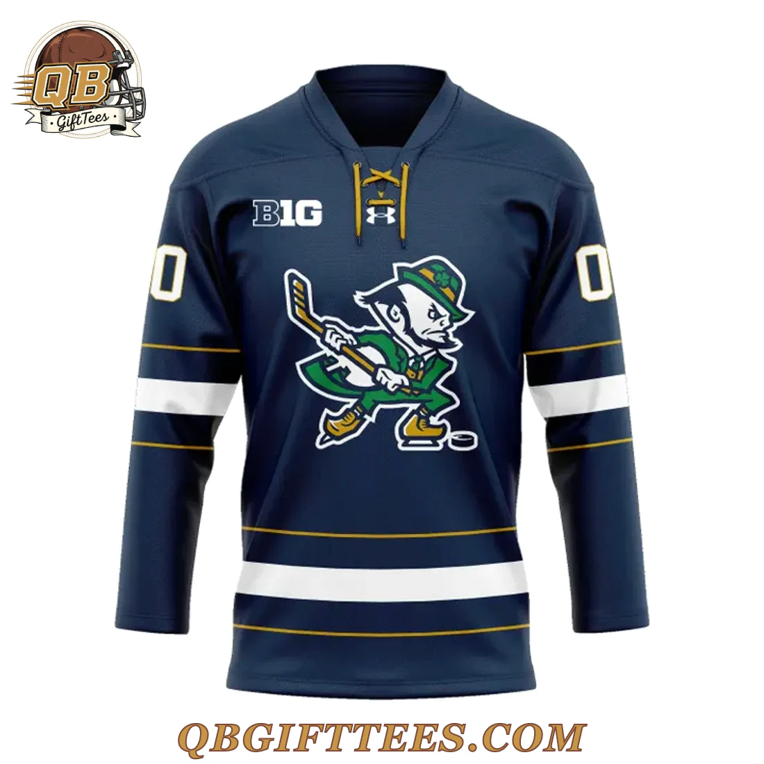 The Notre Dame Fighting Irish Hockey Leprechaun Limited Edition Jersey connects you directly to the spirited tradition and unwavering passion of Fighting Irish fans, embodying the unique energy of Notre Dame hockey. This jersey is designed for every fan who proudly supports their team, reflecting a legacy of excellence. The design features a deep navy blue base with a classic lace-up v-neck collar. Centered on the chest is the iconic Fighting Irish Leprechaun mascot, dynamically depicted playing hockey in green and gold, outlined in crisp white and yellow. Above this emblem, the Big Ten Conference logo is prominently displayed, with the Under Armour logo situated beneath. Both sleeves and the lower hem are detailed with parallel white and yellow stripes, while a white “0” is visible on each shoulder. The reverse side allows for personalization with “ANY NAME” and “00” (or custom numbers) in bold white, outlined in yellow, ensuring your allegiance is unmistakable. Crafted from a premium performance polyester fabric (approx. 200-220 GSM), this jersey offers a comfortable fit with durable stitching throughout.