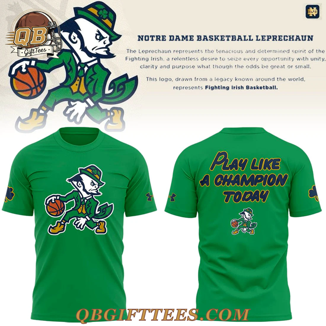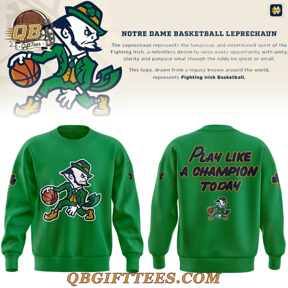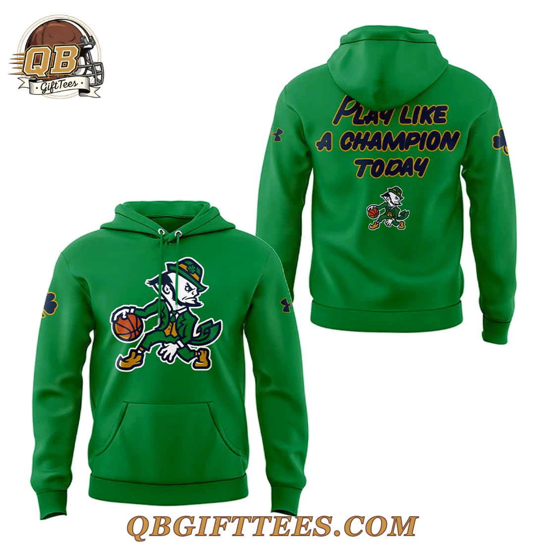 For fans of the legendary Notre Dame Fighting Irish, the Notre Dame Fighting Irish Leprechaun 2025 Limited Edition Hoodie embodies the unwavering spirit and passion that defines the Fighting Irish legacy. This vibrant green hoodie proudly displays the iconic Leprechaun mascot on the front, dynamically dribbling a basketball, rendered in rich gold, white, and navy details. The reverse features the inspiring motto “PLAY LIKE A CHAMPION TODAY” in prominent gold and blue lettering, with a smaller, energetic Leprechaun figure below. Both sleeves showcase a distinct navy and gold Notre Dame shamrock emblem. Crafted from a comfortable 80% cotton, 20% polyester fleece blend, this hoodie offers a substantial 9 oz/yd² fabric weight and a soft fleece interior, ensuring both warmth and durability. It includes a classic hooded design with adjustable drawstrings and a convenient front kangaroo pocket.