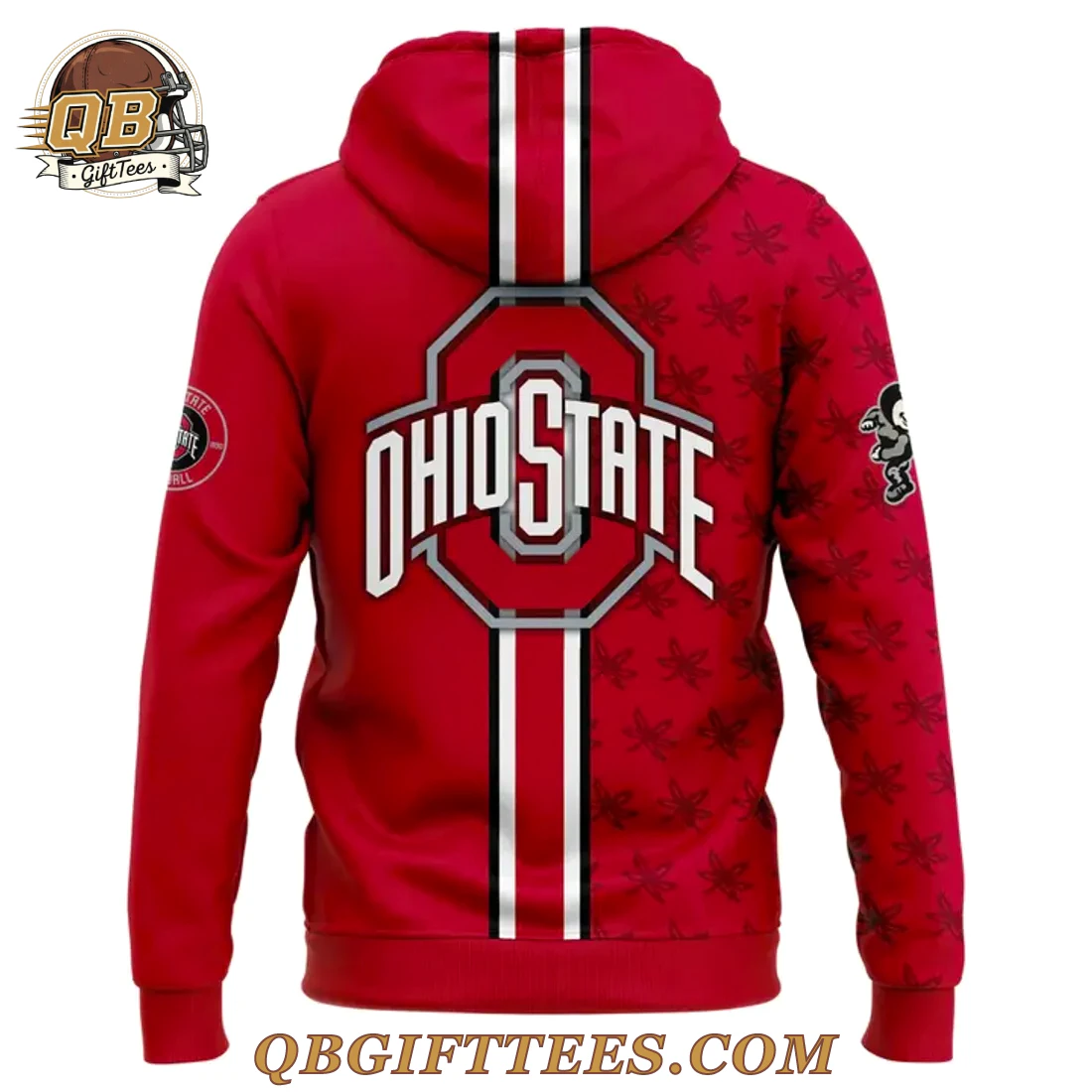 The Ohio State Buckeyes Special Edition Red Hoodie connects fans to the heart of college football tradition, celebrating the vibrant spirit of Columbus. This distinctive garment features a bold split design, with the left side adorned by a subtle, repeating black maple leaf pattern and a classic Brutus Buckeye mascot emblem on the sleeve, alongside the prominent “BIG” logo. The right side presents a solid scarlet red backdrop, highlighted by a black swoosh and a circular “Ohio State Football” emblem on the sleeve. Centrally, a large white “O” with a “0” inside stands out. The reverse mirrors this split aesthetic, with the maple leaf pattern on the left sleeve and a solid red on the right. A prominent “Ohio State” text within a stylized “O” graphic takes center stage on the back. Crafted from a durable 100% polyester fabric, this medium-weight hoodie (approx. 9 oz/yd²) offers a smooth finish, ideal for showcasing its intricate printed details. It includes a drawstring hood and a kangaroo pocket for practical comfort, designed with standard adult unisex sizing.