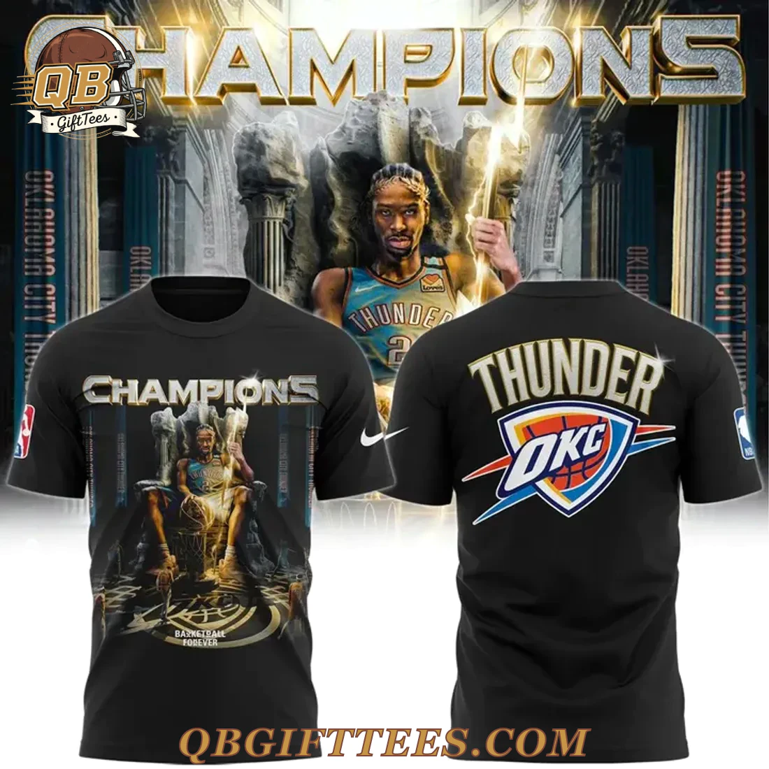 The Oklahoma City Thunder 2025 NBA CHAMPIONS MVP Limited Edition Hoodie represents the unwavering belief and fervent hope of Thunder fans for future glory. This hoodie captures the thrilling vision of a championship victory and an MVP performance, resonating with every fan who dreams of the team hoisting the Larry O’Brien trophy. The front of the hoodie features a striking, detailed graphic of a player, identifiable as Shai Gilgeous-Alexander, seated regally on a throne with lightning effects, framed by championship imagery. The word “CHAMPIONS” is prominently displayed above, and “MVP” is at the lower front, with subtle text reading “BASKETBALL FOREVER” below the throne. Both sleeves bear the official NBA logo and a swoosh. The back of the hoodie showcases the word “THUNDER” in a bold, gold and white font, positioned above the classic OKC shield logo, with an additional NBA logo on the sleeve. Crafted from a soft, durable 80% cotton, 20% polyester fleece blend, this hoodie provides a comfortable mid-weight feel, approximately 8.5 oz/yd² (290 gsm), ideal for year-round wear.
