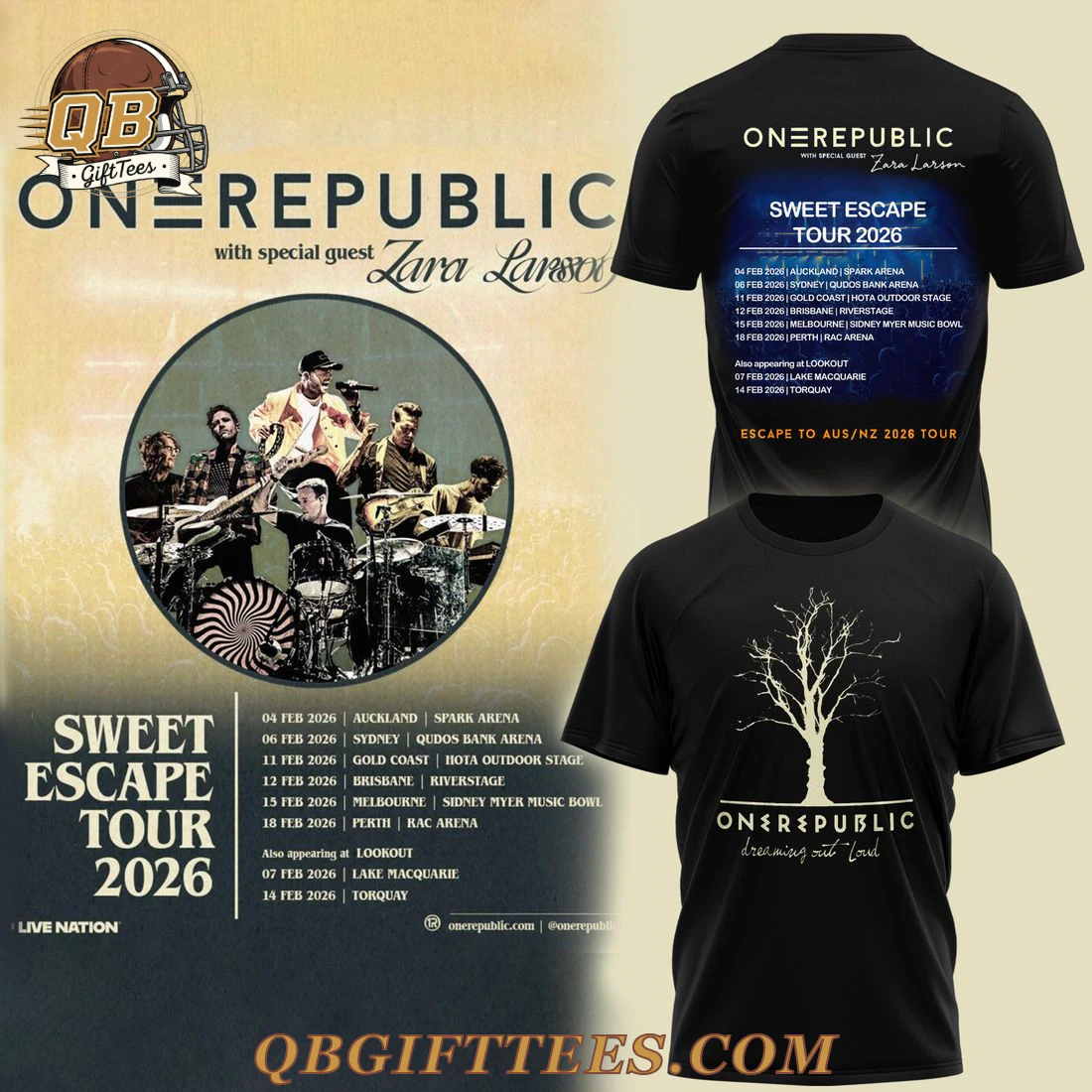 For devoted OneRepublic fans, the OneRepublic Sweet Escape Tour 2026 Hoodie is more than just merchandise; it’s a wearable memento of an anticipated musical journey. The front of this black pullover hoodie features a cream-colored, stylized tree graphic with visible roots, centered above the band name ‘ONEREPUBLIC’ in a matching cream hue, underscored by ‘dreaming out loud’ in an elegant script font. The back of the hoodie prominently displays ‘ONEREPUBLIC with special guest Zara Larsson’ in white text at the top. Below this is a horizontal gradient banner, transitioning from a vibrant blue at the top to a darker shade at the bottom, within which ‘SWEET ESCAPE TOUR 2026’ is printed in white. Beneath the banner, a comprehensive list of tour dates and locations for February 2026 across Australia and New Zealand is presented in white, concluding with ‘ESCAPE TO AUS/NZ 2026 TOUR’. This hoodie is crafted from a durable, soft-touch 8.0 oz (271 gsm) 50% cotton, 50% polyester blend, ensuring both comfort and resilience, complete with a double-lined hood, matching drawcord, and a spacious front pouch pocket.