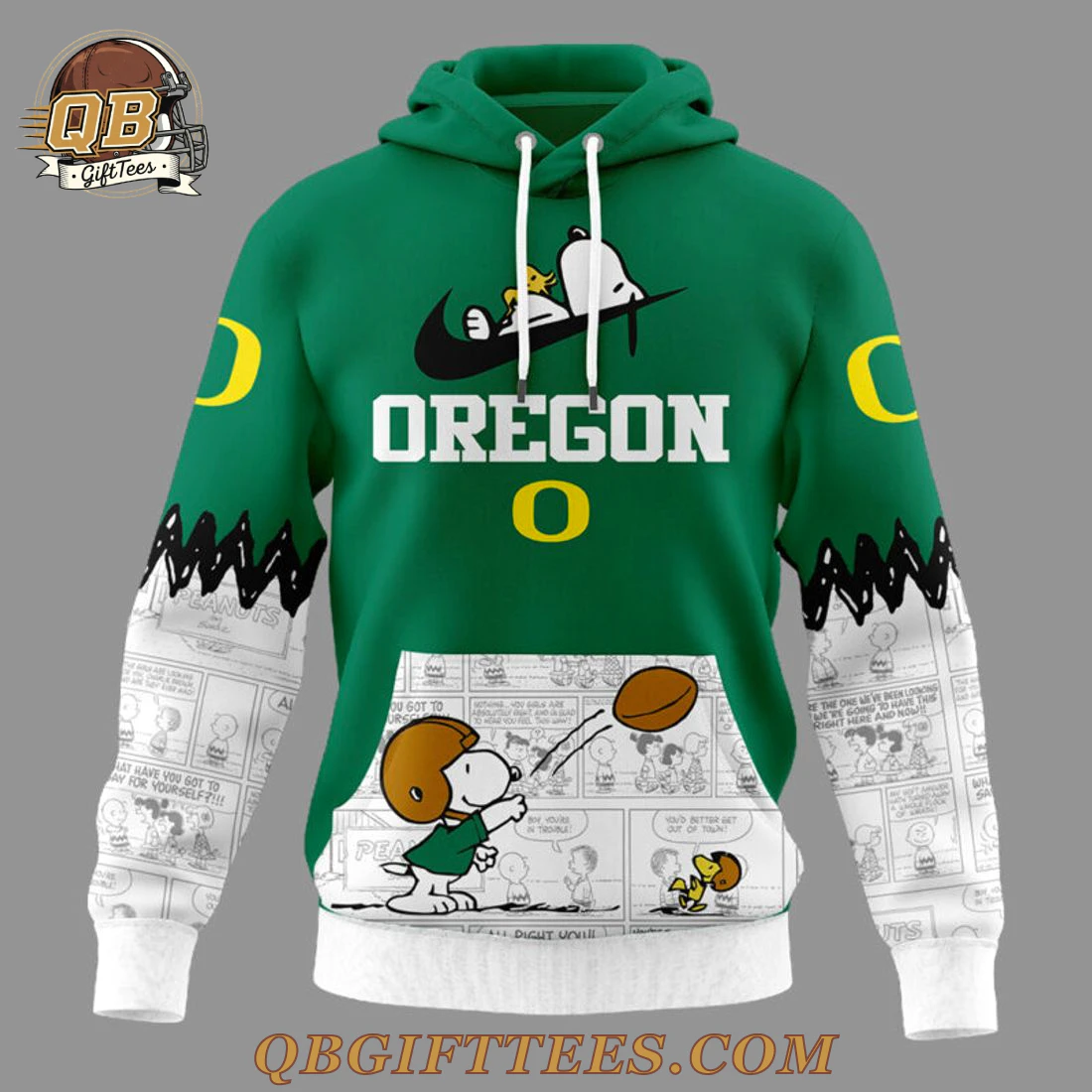 Show your dual loyalty to collegiate pride and timeless cartoon charm with the Oregon Ducks x Snoopy Peanuts Limited Edition Hoodie. This unique pullover hoodie features a vibrant green main body, characteristic of the Ducks’ iconic colors. The front design showcases Snoopy, wearing a football helmet, perched above a black swoosh-like emblem, with “OREGON” prominently displayed in white text and a yellow “O” beneath it. The functional kangaroo pocket across the lower front is adorned with Snoopy mid-kick of a football, alongside Woodstock, set against panels of classic Peanuts comic strips. The sleeves continue this comic strip motif on a white background, separated from the green main body by a jagged black design, and feature yellow “C” or “O” logos near the shoulders. The reverse side proudly displays a large yellow “O” logo, followed by another jagged black pattern. Below this, a charming line-up of Peanuts characters, including Lucy, Charlie Brown, Linus, Snoopy, and Schroeder, are depicted in Oregon Ducks football uniforms, all walking across a canvas of Peanuts comic panels. Crafted from a comfortable polyester-blend fleece, this hoodie offers a substantial yet soft feel, typically around 8 oz/yd² (270 gsm), designed for a standard, relaxed fit.