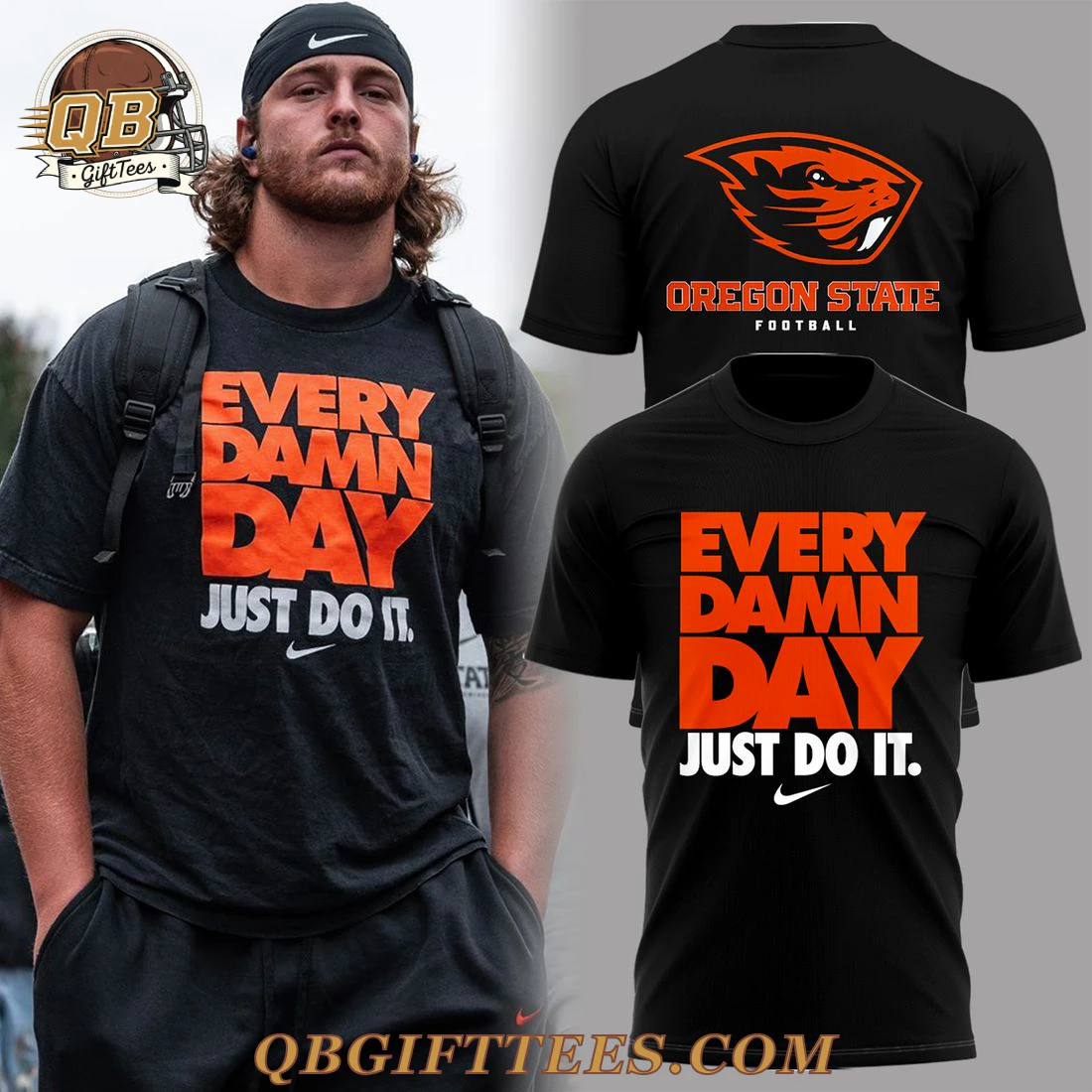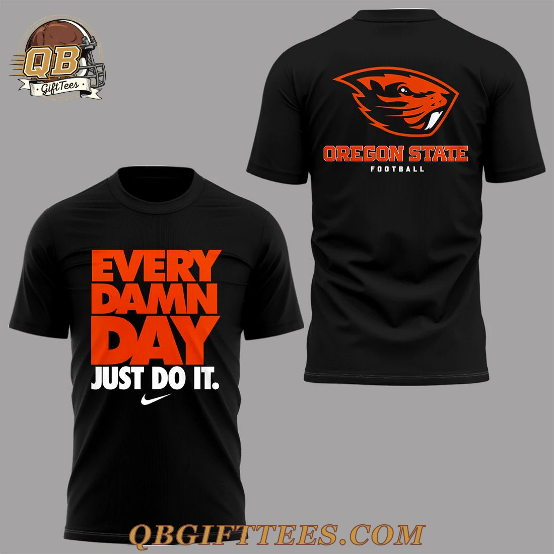 For dedicated Oregon State Beavers fans, the Oregon State Beavers Every Damn Day Edition Shirt embodies the relentless spirit and commitment central to the team’s identity. This shirt is designed for supporters who live and breathe Beavers football, offering a subtle nod to unwavering dedication that resonates across all fan generations. The front of this black short-sleeve crewneck features the bold phrase “EVERY DAMN DAY” in a prominent orange typeface, with “JUST DO IT.” in contrasting white text directly below it, accompanied by the iconic white swoosh. On the back, the distinctive Oregon State Beavers logo, an aggressive beaver head, is printed in orange, followed by “OREGON STATE” and “FOOTBALL” also in orange, signaling true allegiance. Crafted from a soft, breathable cotton-polyester blend, this Oregon State Beavers Every Damn Day Edition Shirt provides a comfortable, standard fit ideal for everyday wear, ensuring both durability and ease of movement.