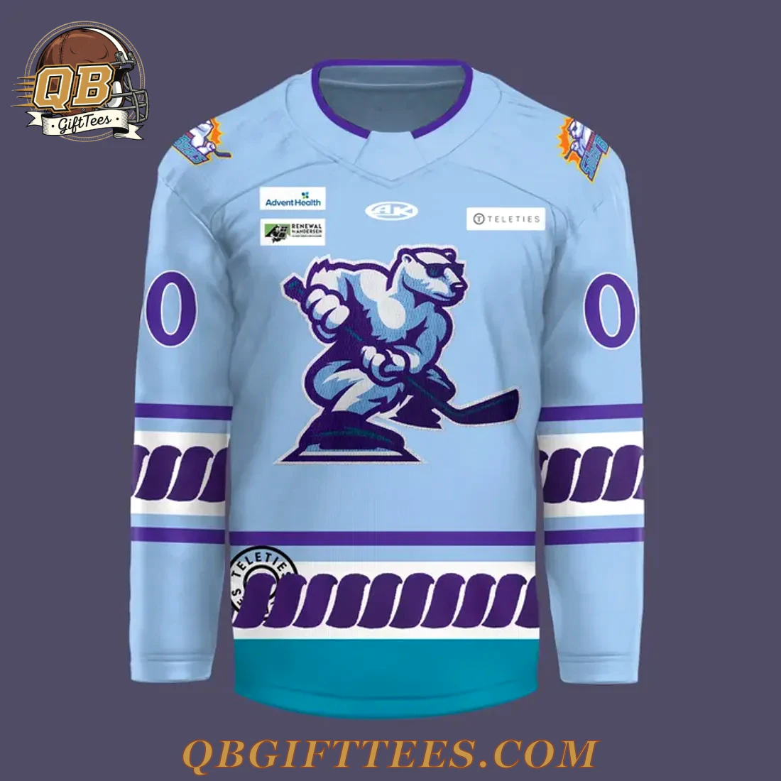This Orlando Solar Bears Women in Hockey Night Jersey 2025 Edition Jersey represents more than just team apparel; it’s a vibrant statement of support for the Solar Bears and the growing presence of women in hockey. Designed to capture attention on and off the ice, the jersey features a light blue base color accented by bold purple and teal elements. The front proudly displays the iconic Solar Bears main logo: a hockey-playing polar bear sporting cool sunglasses. Adorning the upper chest are sponsor logos including AdventHealth, Renewal by Andersen, and Teleties. The sleeves and lower hem showcase a distinctive rope-like pattern in purple, set against white and light purple stripes, concluding with a teal band at the very bottom. Each sleeve features a large “0” numeral, while the shoulders bear a smaller Solar Bears emblem. The reverse side is designed for personalization, offering space for “ANY NAME” and “00” numerals. Crafted from a durable, breathable 100% polyester knit fabric, typical of athletic jerseys, this garment is engineered for comfort and longevity*. This jersey type generally features a mid-weight feel, around 200-250 GSM, designed to withstand enthusiastic fan wear.