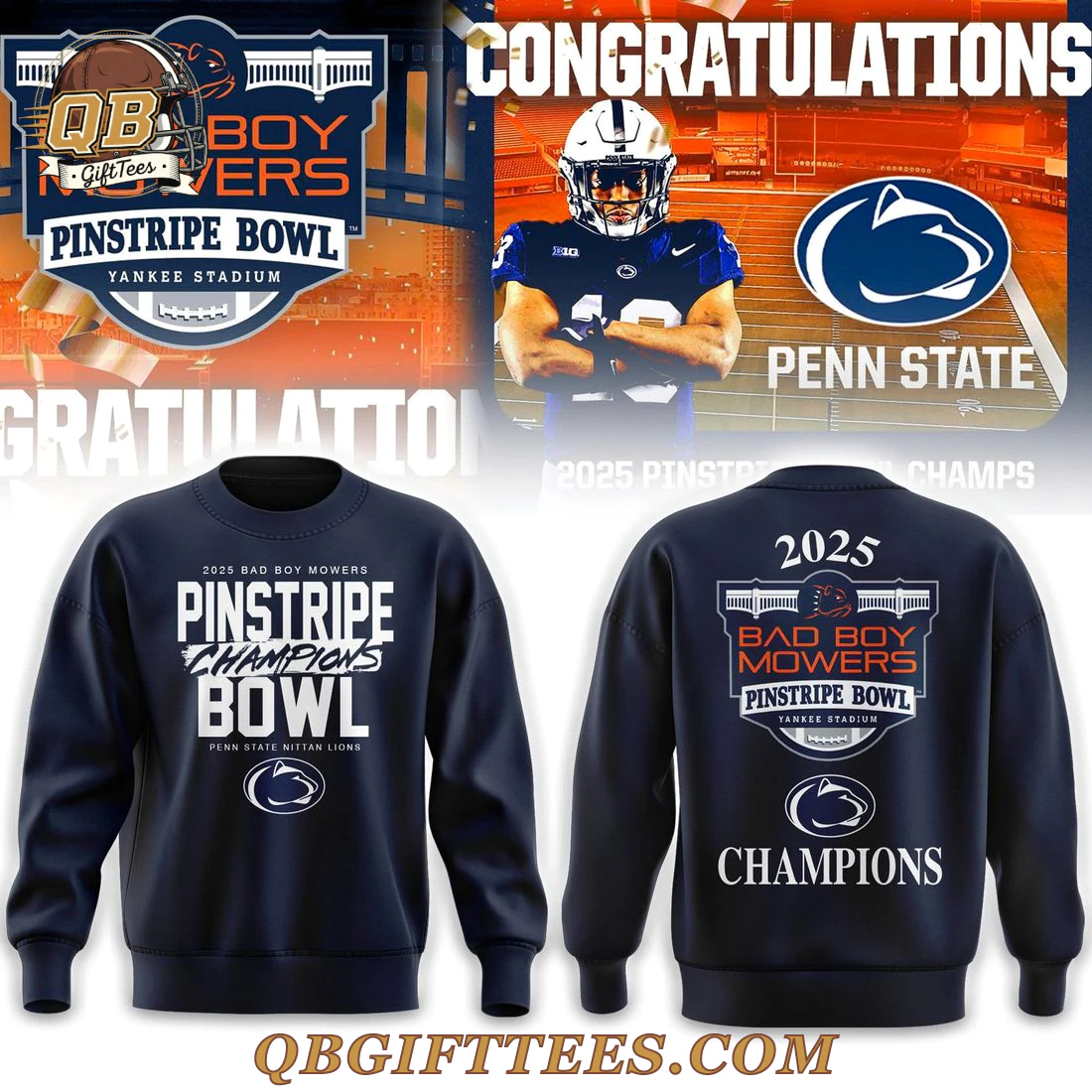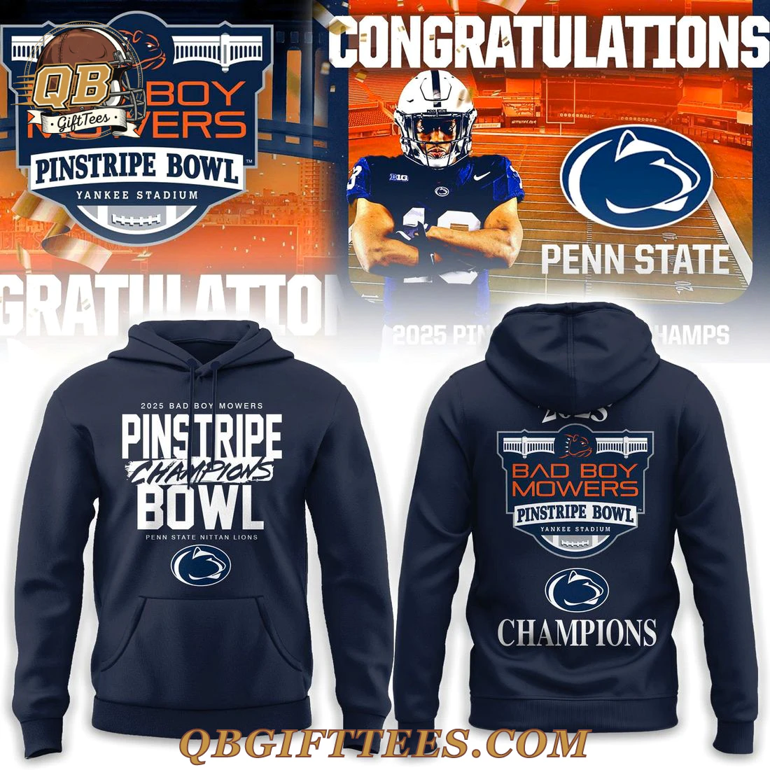 Celebrate a monumental victory with the Penn State Nittany Lions Pinstripe Bowl Champions Limited Edition Hoodie, a perfect way for fans to honor the team’s achievement. This navy blue pullover hoodie features a comfortable, standard fit, designed for everyday wear. The front prominently displays “2025 BAD BOY MOWERS Pinstripe Champions Bowl” in bold white lettering, along with “PENN STATE NITTANY LIONS” and the iconic Nittany Lion logo beneath. The back of the hoodie is equally striking, showcasing “2025” at the top, followed by the official Bad Boy Mowers Pinstripe Bowl logo with “Yankee Stadium” detailed, and again the Nittany Lion logo and a definitive “CHAMPIONS” at the bottom. Constructed from a premium cotton-polyester fleece blend, this hoodie offers a soft interior and a durable exterior, providing a comfortable mid-weight feel ideal for warmth and comfort without excessive bulk. It includes a functional drawstring hood and a front kangaroo pocket.