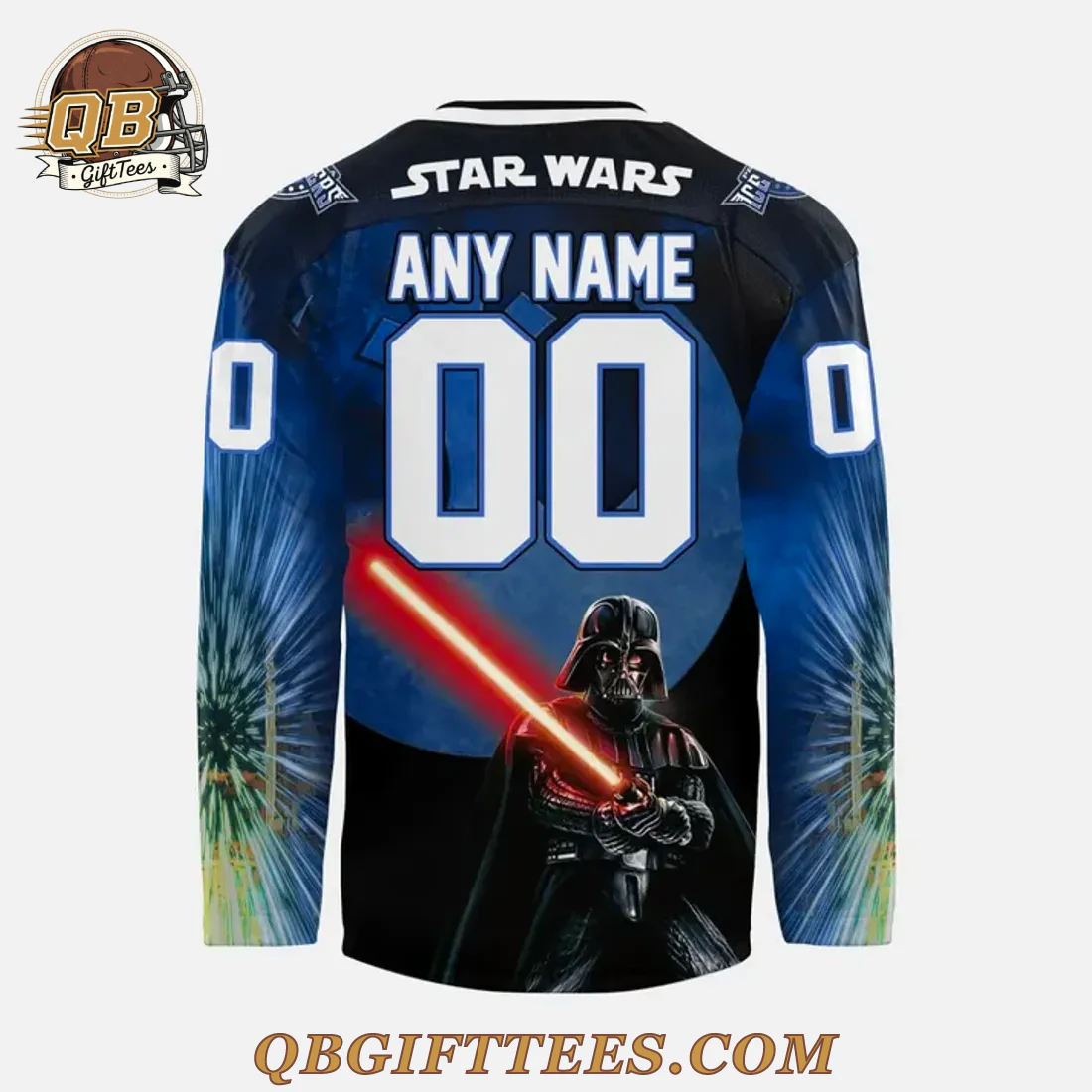 For fans who connect the thrill of hockey with the epic saga of a galaxy far, far away, the Pensacola Ice Flyers Star Wars Night Limited Edition Jersey offers a unique convergence of two beloved universes. This commemorative jersey features a vibrant blue base, adorned with a dynamic tie-dye and starburst pattern on the sides, reminiscent of hyperspace travel. The front proudly displays the iconic Rebel Alliance symbol, with the beloved droids C-3PO and R2-D2 prominently positioned. The shoulders are subtly accented with repeated Pensacola Ice Flyers logos. It includes a classic V-neck collar with an internal black trim and a small “SPORTS PRO” insignia. The sleeves feature bold white ‘0’ digits. On the reverse, the jersey proclaims ‘STAR WARS’ above a customizable ‘ANY NAME’ and ’00’ numbers, all in crisp white. A striking image of Darth Vader wielding his red lightsaber dominates the back. This Pensacola Ice Flyers Star Wars Night Limited Edition Jersey is constructed from 100% breathable polyester performance fabric, weighing approximately 200 GSM, ensuring comfort and durability with a high-definition sublimated print technique for lasting imagery.