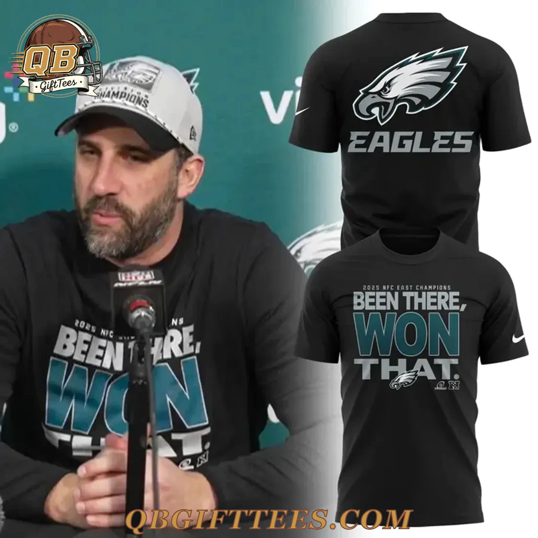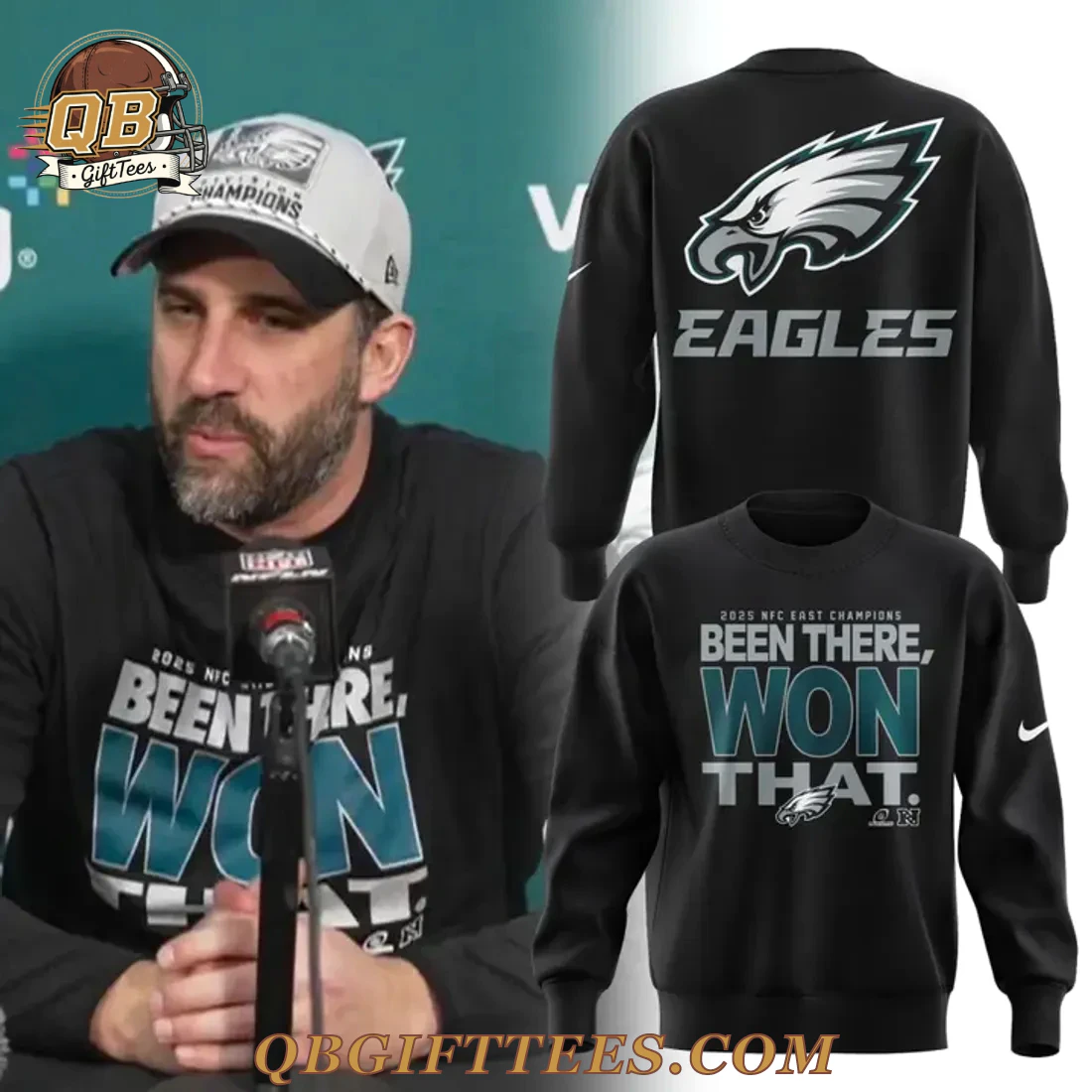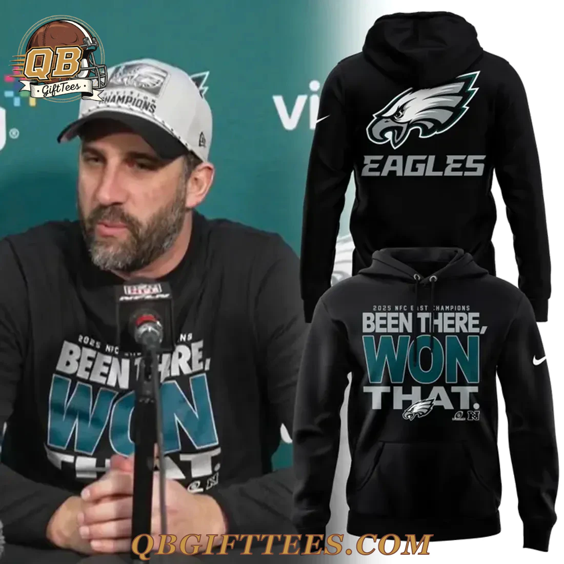 For passionate fans of the Philadelphia Eagles, the Philadelphia Eagles 2025 NFC East Division Champions Limited Edition Hoodie embodies the spirit of unwavering confidence and future triumph. This black hooded sweatshirt features a bold design, perfect for showcasing your team pride. The front prominently displays “2025 NFC EAST CHAMPIONS” above the impactful phrase “BEEN THERE, WON THAT.” in contrasting white/grey and teal/dark green lettering, accented by a small white/grey Eagles logo at the bottom right. A subtle white swoosh is visible on the left sleeve cuff. The back of the hoodie showcases a large, iconic white/grey Eagles head logo with teal accents, positioned above the team name “EAGLES” in white/grey text. Another small white swoosh is present on the upper right back. Crafted from a comfortable 80% cotton, 20% polyester blend fleece, this hoodie offers a substantial 8.5 oz/yd² (280 gsm) weight, providing a premium feel and durable construction. It includes a classic drawstring hood, a convenient kangaroo pocket, and ribbed cuffs and hem for a secure fit.