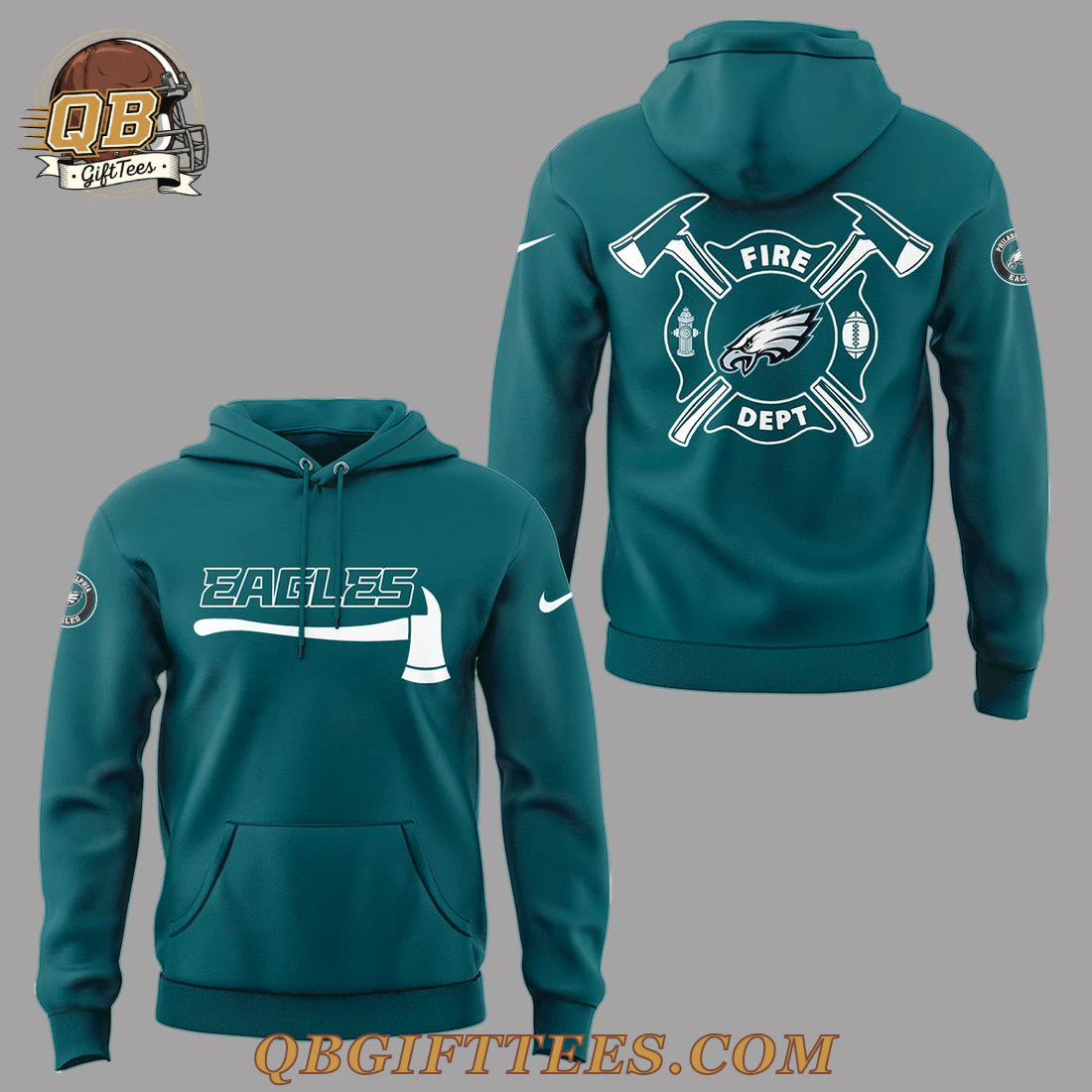 The Philadelphia Eagles Firefighter Appreciation Hoodie offers fans a heartfelt way to celebrate their team while honoring the dedication of firefighters. This hoodie features a deep teal body, a signature color of the Eagles, adorned with crisp white graphics. On the front, the word “EAGLES” is prominently displayed, ingeniously integrating an axe motif where the ‘L’ forms the handle and an axe head completes the design. A subtle white swoosh is visible on the upper right chest. The back of the hoodie showcases a distinctive circular emblem featuring two crossed axes, flanking the iconic Philadelphia Eagles logo. Within this emblem, a fire hydrant and a football represent key elements of the theme, with “FIRE” and “DEPT” text completing the tribute. A small Eagles logo patch is stitched onto the left sleeve, and another swoosh is on the upper back. Crafted from a comfortable 80% cotton, 20% polyester fleece blend, this hoodie provides a substantial feel with a mid-weight fabric approximately 8.5 oz/yd², ideal for everyday wear. It features a classic pullover style with a kangaroo pocket and an adjustable drawstring hood.