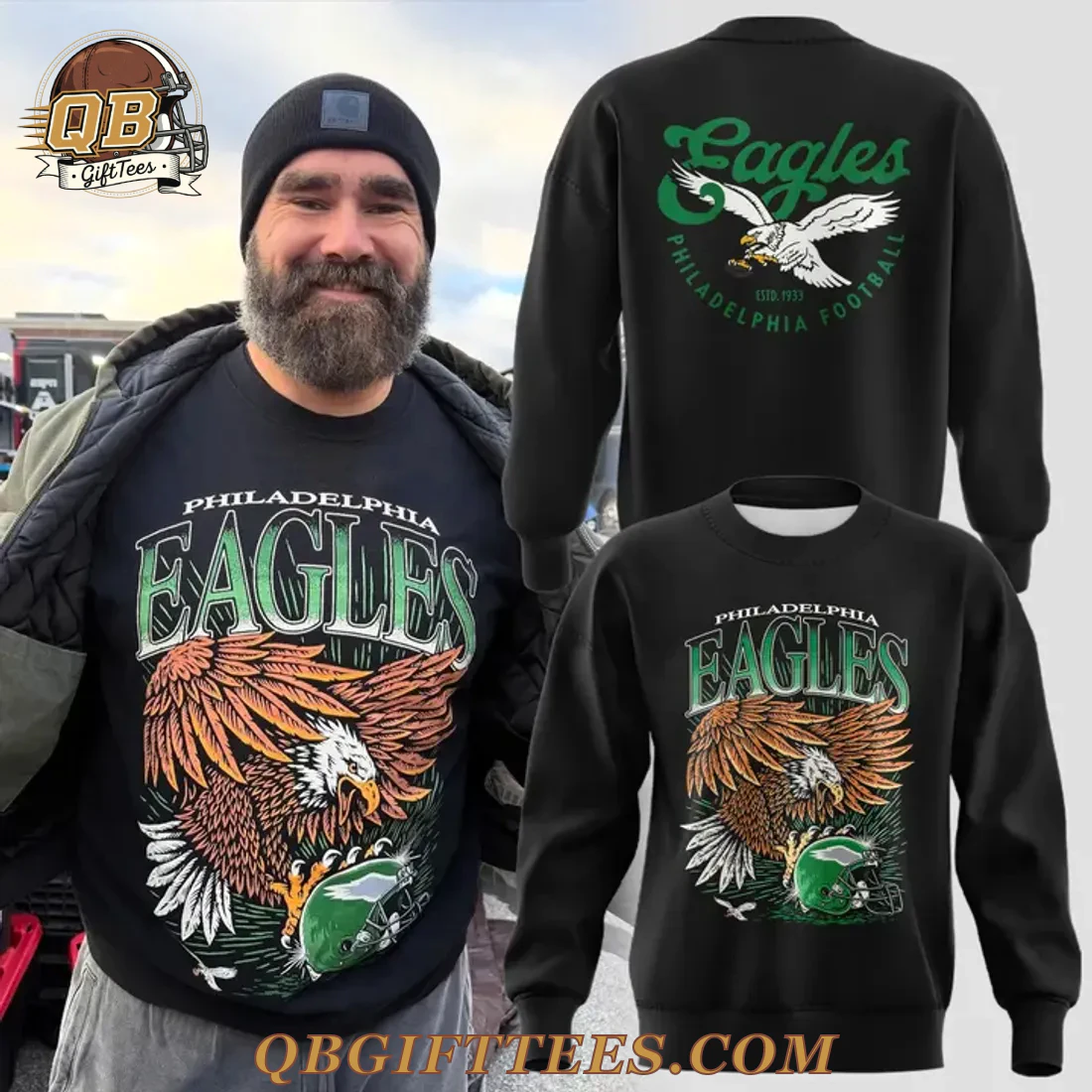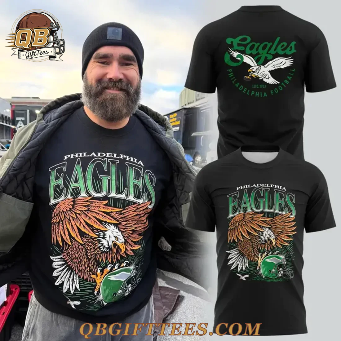 For every fan who carries the spirit of Philadelphia in their heart, the Philadelphia Eagles Vintage-Inspired Graphic Limited Edition Shirt is more than just apparel—it’s a wearable testament to enduring loyalty and passion for the Birds. This design captures the raw energy and iconic imagery synonymous with Eagles football, making a bold statement whether you’re at the stadium or representing your team elsewhere. The front of this striking black crewneck t-shirt features a commanding central graphic: the word “PHILADELPHIA” arching in distressed white text above “EAGLES” rendered in a vibrant, textured green, evoking a classic, worn-in aesthetic. Below, a powerful bald eagle, depicted with intricate detailing in shades of rich brown, golden orange, and crisp white on its head, spreads its formidable wings over a dark green football helmet. Small white specks around the eagle and helmet add to the dynamic, vintage effect. The back of the shirt is solid black, allowing the intricate front graphic to remain the focal point. Crafted from 100% combed ring-spun cotton for a soft handfeel and durable wear, this shirt features a precise 4.3 oz/yd² (145 g/m²) fabric weight, offering both comfort and quality*.