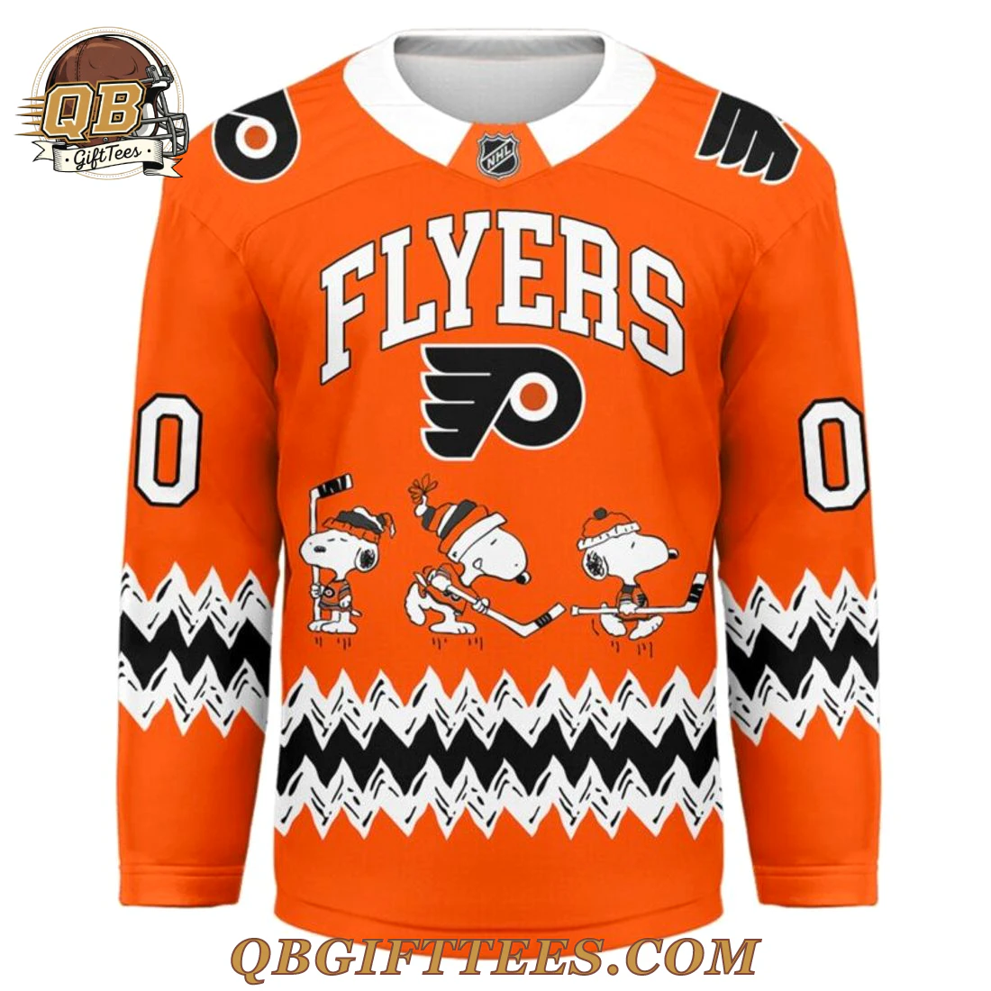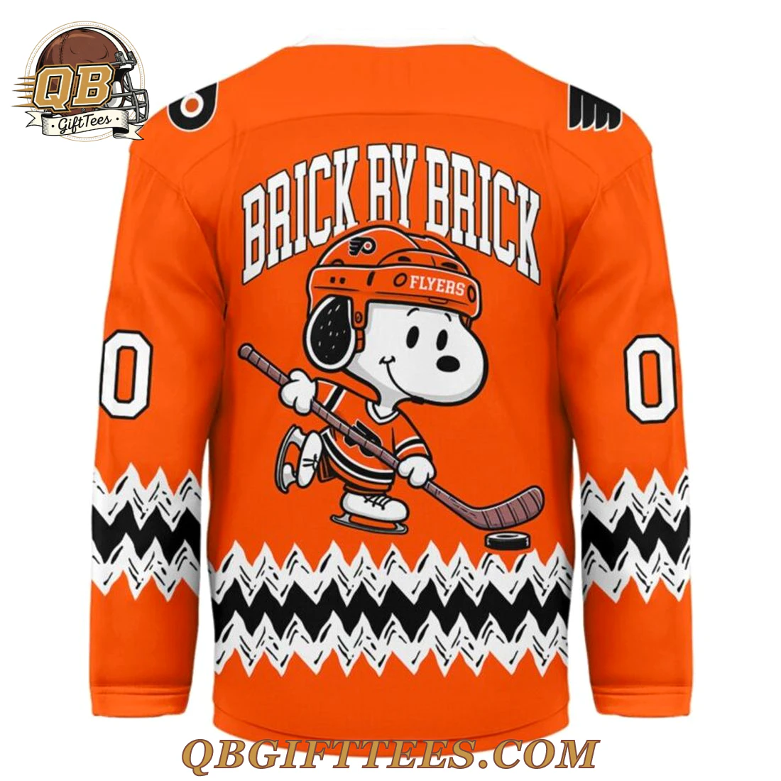 The Philadelphia Flyers x Snoopy Limited Edition Hoodie offers a unique blend of fandom, celebrating the fierce spirit of the Flyers alongside the enduring charm of Peanuts characters. This vibrant orange long-sleeve top, styled like a classic hockey jersey, features a crisp white ribbed knit collar and black shoulder yokes. The front proudly displays “FLYERS” in white with a black outline above the iconic winged P logo. Along the lower hem, a dynamic black and white zigzag pattern frames three playful Snoopy figures, each engaged in hockey action. The back of the jersey showcases “BRICK BY BRICK” in bold white lettering, a nod to team resilience, above a large graphic of Snoopy, geared up in a Flyers helmet and stick in hand, ready to hit the ice. White “0” numerals are visible on both shoulders, front and back, and an official NHL shield adorns the front collar. Constructed from a durable, moisture-wicking polyester fabric, this garment is designed for comfort and sustained wear. It features sublimation printing for vibrant, long-lasting graphics and reinforced seams for structural integrity.