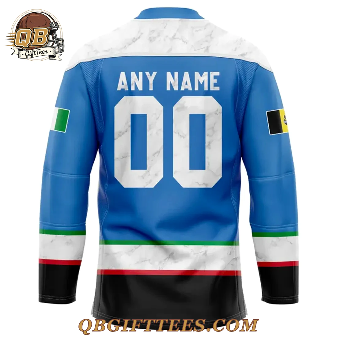 The Pittsburgh Penguins x Italian Heritage Night Edition Hockey Jersey offers a unique way for fans to celebrate their team spirit and heritage. This design resonates with supporters who honor their Italian roots while passionately cheering on the Penguins. The jersey features a vibrant light blue base, accented by a distinctive white marble-patterned yoke across the shoulders and a matching V-neck collar. Centered prominently on the chest is the classic Pittsburgh Penguins skating penguin logo, framed by a green, white, and red outline, evoking the Italian flag. The sleeves showcase an Italian flag motif on the right arm and a black, yellow, and red striped flag on the left arm. Horizontal stripes in green, white marble, red, and black adorn the lower body and cuffs. The back of the jersey mirrors the front’s light blue base and marble yoke, featuring a customizable nameplate (“ANY NAME”) and number (“00”) in a white, marble-patterned font. This garment is constructed from a lightweight, breathable performance polyester fabric*, designed for comfort.