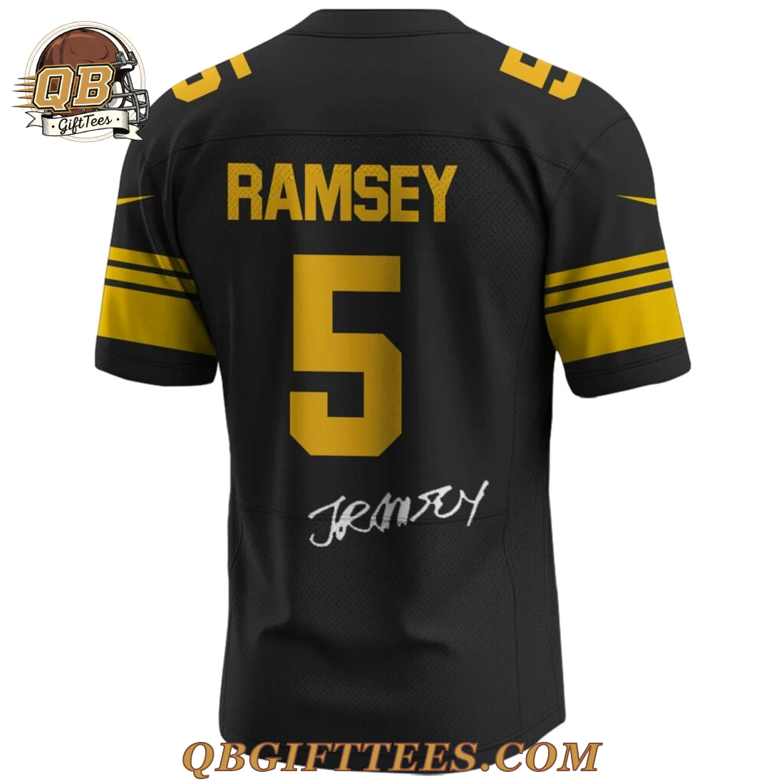 For every Steelers fan, this Pittsburgh Steelers Black Gold Legacy Limited Edition Jersey represents a deep connection to the team’s rich history and enduring spirit. This striking jersey features a sleek black primary color, accented with bold gold detailing. A prominent number “5” is displayed on both the front and back, rendered in a vibrant gold block font. The back of the jersey showcases “RAMSEY” in matching gold letters above the number, with an apparent “J Ramsey” signature subtly placed below it. Dual gold stripes adorn each sleeve, complemented by a gold Swoosh. The V-neck collar features the official NFL shield, while the iconic Pittsburgh Steelers logo is proudly positioned on the left chest. Crafted from 100% performance polyester mesh fabric, this jersey is designed for optimal breathability and a lightweight feel, typically weighing approximately 0.6 lbs for an adult size large, ensuring comfort and durability.