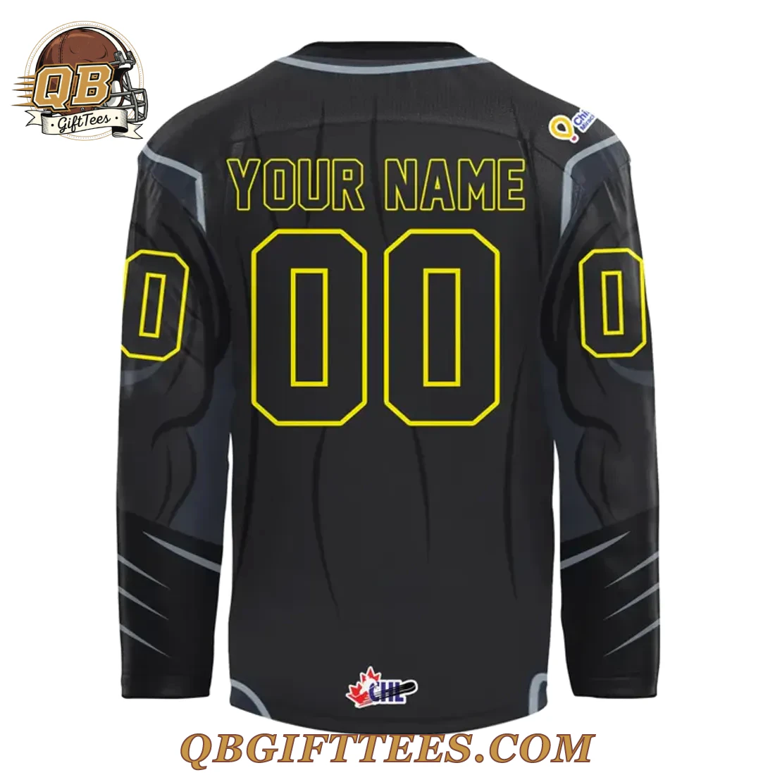 Embrace your dual fandom for the Prince George Cougars and the Caped Crusader with this unique Prince George Cougars Batman Hockey Jersey. This striking design features a dominant black and charcoal grey color scheme, meticulously replicating Batman’s armored suit, complete with muscle contours and a detailed yellow utility belt across the waistline. Centered proudly on the chest is the iconic yellow Prince George Cougars logo, a fierce cougar head within a circular emblem. The front also displays the official WHL logo on the right chest and the RE/MAX sponsor logo on the left, with a Children’s Hospital logo subtly placed near the right shoulder. Bold yellow ‘0’ numbers are visible on both sleeves. The back continues the thematic design, offering a customizable “YOUR NAME” area above large yellow “00” numbers, complemented by a CHL logo with a Canadian maple leaf at the bottom hem and another Children’s Hospital logo at the top center. Constructed from a durable, mid-weight 100% polyester fabric, this jersey is designed for a comfortable, relaxed fit.