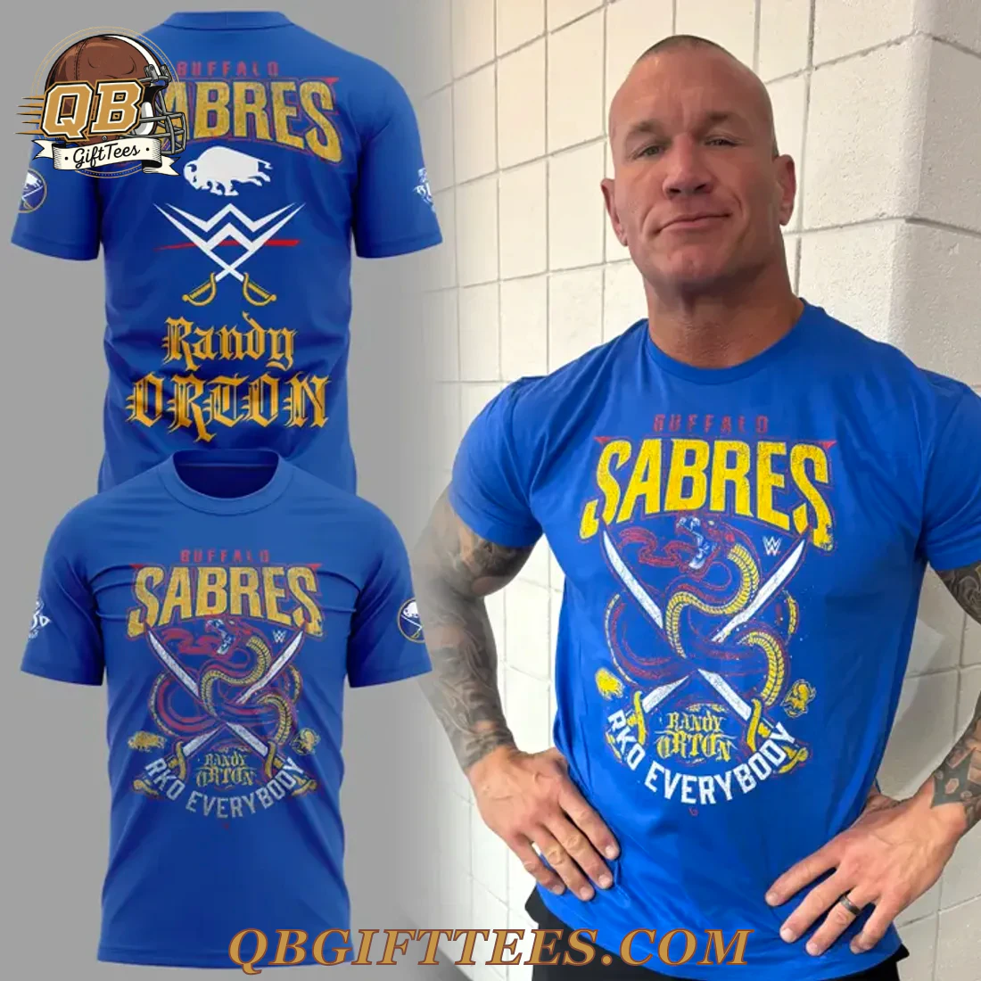 Fans of both WWE Superstar Randy Orton and the Buffalo Sabres can now showcase their dual allegiance with the Randy Orton x Buffalo Sabres 2026 T-Shirt. This unique design perfectly blends the fierce persona of Orton with the proud spirit of the Sabres, appealing to wrestling and hockey enthusiasts alike. The royal blue shirt features a striking front graphic: “BUFFALO SABRES” in a distressed yellow/gold font above a dynamic emblem of a red snake coiled around crossed swords, subtly incorporating the WWE logo. Below this, “RANDY ORTON” is displayed along with “RKO EVERYBODY.” The back of the Randy Orton x Buffalo Sabres 2026 T-Shirt mirrors the “BUFFALO SABRES” text in distressed yellow/gold, positioned above a white Sabres charging buffalo logo, the WWE emblem, and crossed swords. “Randy Orton” is also featured on the back in a distinct gold gothic-style font. A Buffalo Sabres primary logo is present on the left sleeve. This tee is constructed from 100% preshrunk ring-spun cotton for comfort and durability, offering a mid-weight 5.3 oz/yd2 (180 g/m2) fabric for a substantial feel.