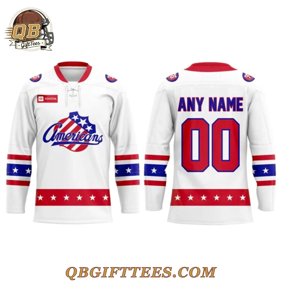 For Rochester Americans fans, this Rochester Americans 70th Anniversary Throwback Limited Edition Hockey Jersey represents a direct connection to the team’s enduring legacy and spirited past. Designed to evoke a classic era, this jersey features a clean white base, accented with vibrant red and blue. The front proudly displays the iconic “Americans” script in blue over a distinctive shield emblem, patterned with red and blue stripes and white stars, celebrating a patriotic theme. A red V-neck collar with white lacing adds to the vintage aesthetic, complemented by a small “TOYOTA” sponsor logo on the upper chest. Both shoulders feature a circular patch with red trim and a blue inner circle adorned with white stars. The sleeves are detailed with bold red and blue stripes, interspersed with a band of white stars against a blue background, mirrored by a similar star-spangled band along the lower hem. Crafted from durable, breathable polyester knit, this jersey is built for comfort and lasting wear, ideal for showing your allegiance.