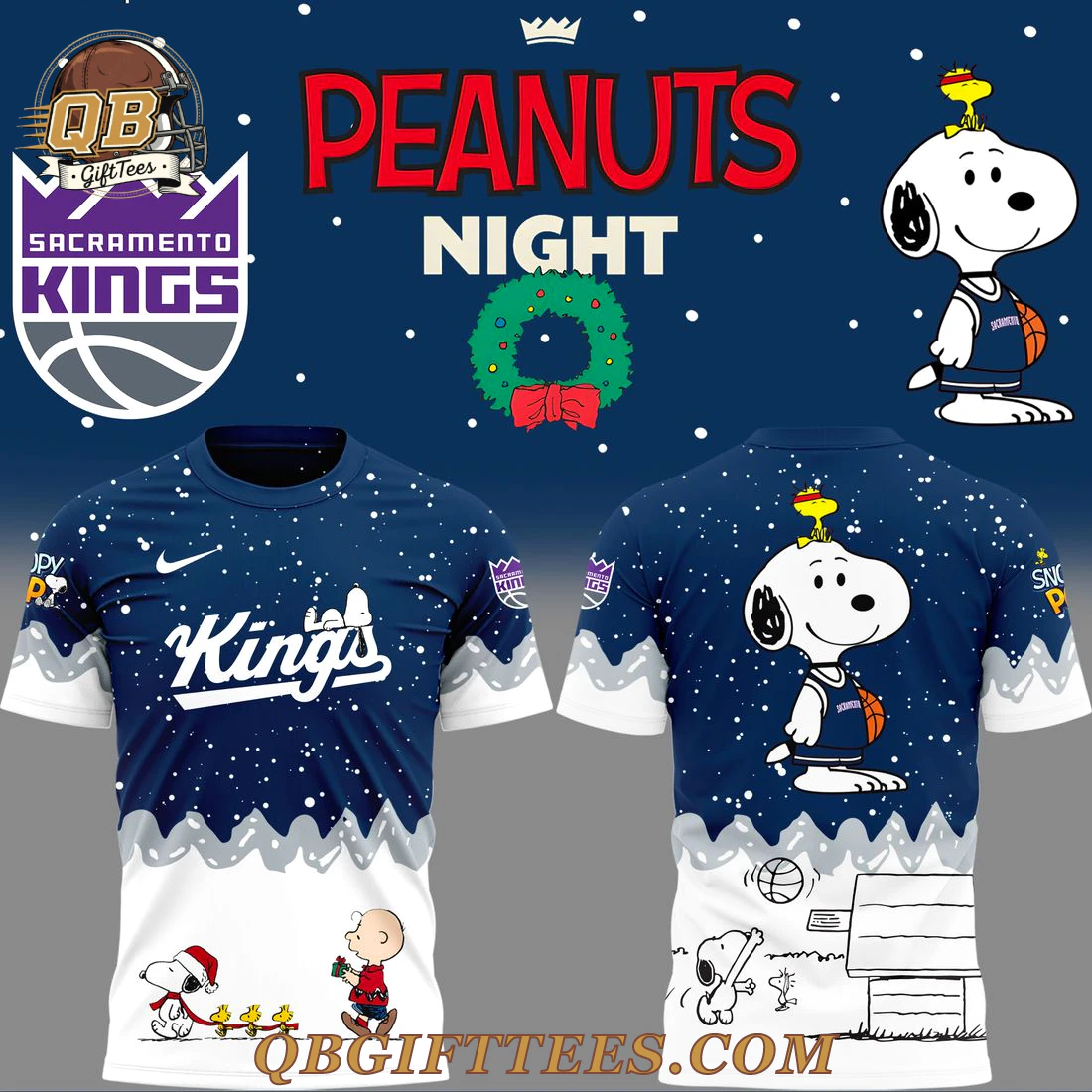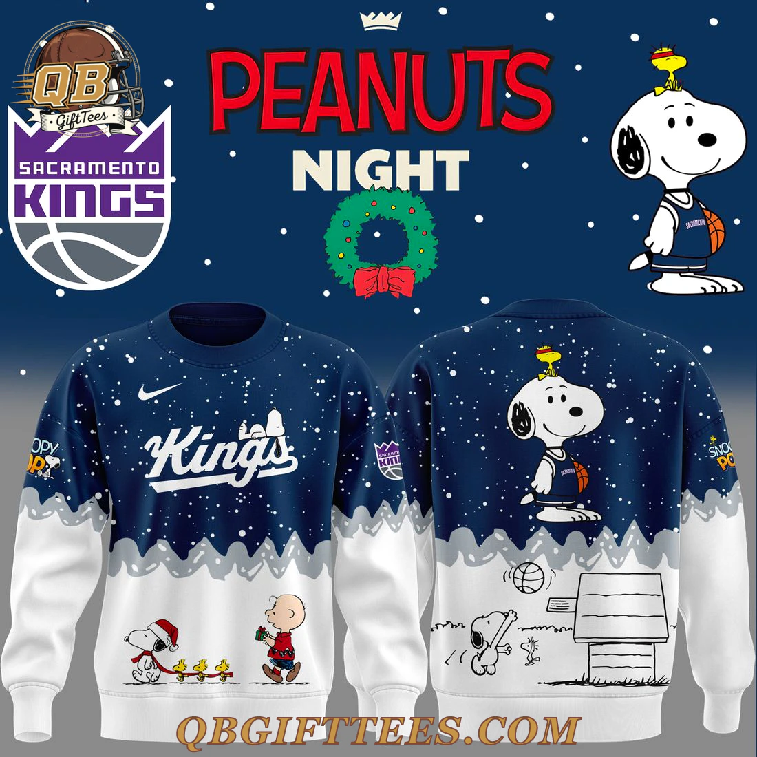 Celebrate your love for the Sacramento Kings and the timeless charm of Peanuts with the Sacramento Kings x Peanuts Night Edition Hoodie. This festive design perfectly blends NBA fandom with holiday cheer, appealing to Kings devotees and cartoon enthusiasts alike. The hoodie features a rich navy blue upper half speckled with white snow, transitioning to a crisp white lower section. On the front, the iconic ‘Kings’ script logo is proudly displayed in white with a snowy accent, accompanied by a subtle swoosh. Below, a heartwarming scene unfolds with Snoopy in a Santa hat leading Woodstock and Charlie Brown, who carries a gift, across the white lower panel. The back showcases a large, playful Snoopy wearing a Kings jersey and dribbling a basketball, with Snoopy’s doghouse and more Peanuts characters enjoying a winter game beneath. Made from a soft, durable polyester blend, this hoodie offers a comfortable feel, typically featuring an adjustable drawstring hood, long sleeves, and a front kangaroo pocket. The vibrant, long-lasting sublimated print ensures the detailed graphics remain crisp.