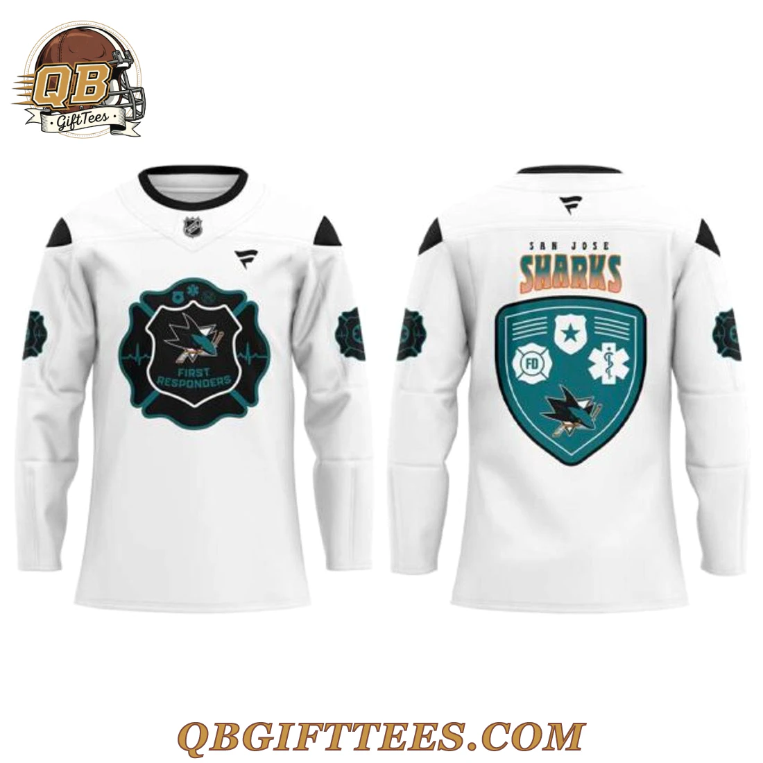 The San Jose Sharks First Responders Night 2026 Edition Hockey Jersey is a meaningful tribute to the brave individuals who serve our communities, allowing fans to proudly display their support for both the San Jose Sharks and first responders. This fan jersey features a clean white base with contrasting black shoulder panels and collar trim. The front prominently displays a dark teal, fire department Maltese cross-shaped emblem with the San Jose Sharks logo at its center, encircled by a teal heartbeat graphic and the words “First Responders.” A subtle NHL shield is positioned at the collar, alongside the Fanatics brand emblem. On the back, “SAN JOSE SHARKS” is rendered in orange and black above a large teal shield emblem, which integrates a star, an FD logo, a medical cross, and the San Jose Sharks logo. The sleeves include circular teal and black patches. Crafted from 100% breathable polyester fabric, this jersey offers a comfortable fit suitable for various fan activities. It weighs approximately 0.7 lbs (320g) for a men’s size Large, reflecting a standard mid-weight fan jersey construction.