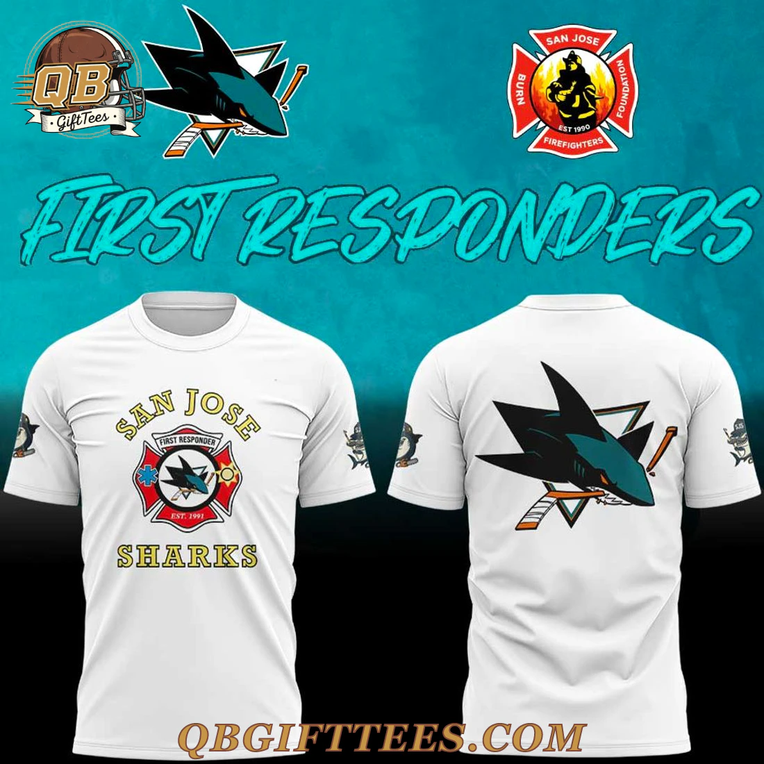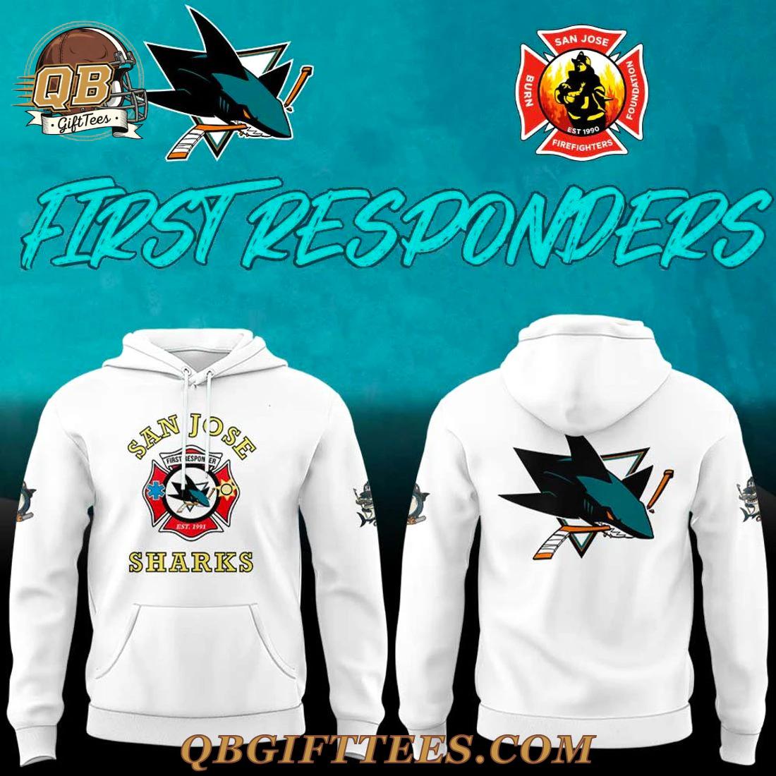For San Jose Sharks fans, the San Jose Sharks First Responders Night Edition Hoodie offers a meaningful way to express both team loyalty and appreciation for the vital service of first responders. The front of this white pullover hoodie features a central graphic: “SAN JOSE” is arced above a detailed red and white Maltese cross-like emblem, which prominently displays a first responder figure, a “FIRST RESPONDER” banner, and “EST. 1991.” Below this, “SHARKS” is boldly printed. The back showcases the iconic San Jose Sharks primary logo – a teal shark biting through a hockey stick – rendered in its recognizable black, teal, and orange/white color scheme. Smaller versions of the official Sharks logo adorn both sleeves. This hoodie is constructed from a comfortable mid-weight polyester-cotton blend fabric, offering a soft brushed interior for added warmth.