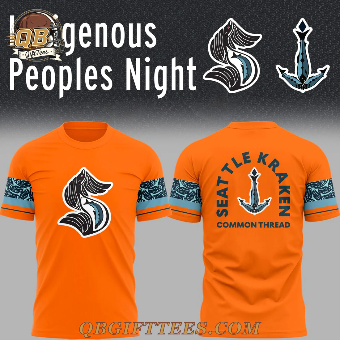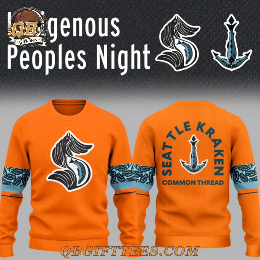 Show your support for the Seattle Kraken and celebrate Indigenous cultures with the Seattle Kraken x Indigenous Peoples Night Special Edition Hoodie. This vibrant orange pullover hoodie features the iconic Kraken ‘S’ logo on the front, reimagined with intricate, Indigenous art-inspired designs forming the kraken’s tentacle and eye in teal and black accents against a white background. Both sleeves showcase a light blue band adorned with a darker, repeating pattern inspired by traditional Indigenous artwork. The back proudly displays a stylized anchor, again with Indigenous design elements, in teal and black, encircled by “SEATTLE KRAKEN” in an arc, with “COMMON THREAD” printed below. Crafted from a comfortable 80% cotton, 20% polyester blend fleece weighing approximately 8.5 oz/yd² (280 gsm), this hoodie offers a soft, brushed interior for warmth, along with a kangaroo pocket and adjustable drawstring hood.