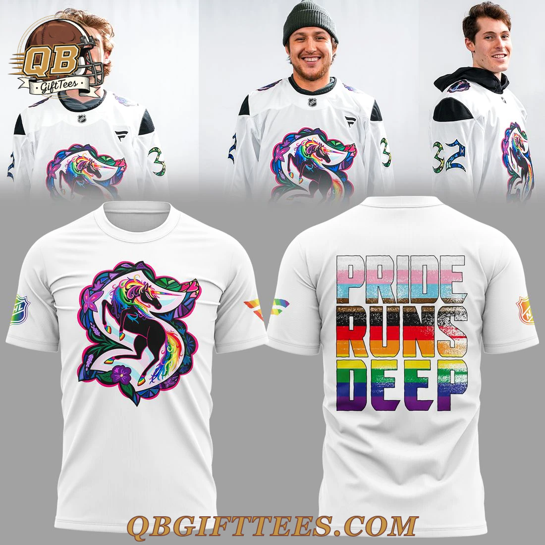 The Seattle Kraken x Pride Runs Deep Hoodie allows fans to authentically express their support for both the team and the vibrant LGBTQ+ community, embracing the spirit of inclusivity that defines Seattle hockey. This white pull-over hoodie features a striking, multi-colored unicorn emblem on the front, rendered in dynamic shades of pink, purple, green, and blue, with the unicorn itself in black and adorned with rainbow accents on its horn, mane, and tail. A subtle NHL shield logo is positioned on the left sleeve, complemented by a small pride flag emblem on the right sleeve. On the back, the phrase “PRIDE RUNS DEEP” is prominently displayed in stacked vertical lettering, with each line segment colored to represent various pride flags, including the transgender flag, black and brown inclusive stripes, and the traditional rainbow flag, all presented with a subtly distressed texture. Crafted from a comfortable 8 oz (270 GSM) 50% cotton / 50% polyester blend fleece, this hoodie offers a soft, brushed interior and a smooth, durable exterior, designed for a standard unisex fit.